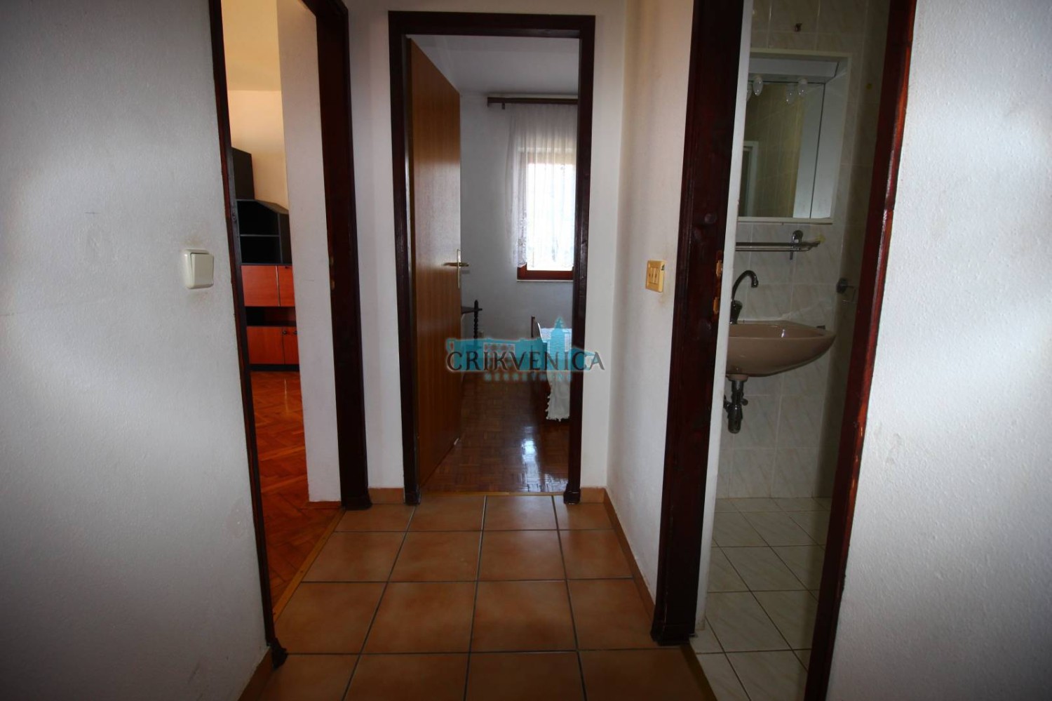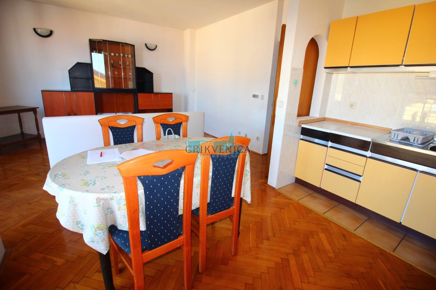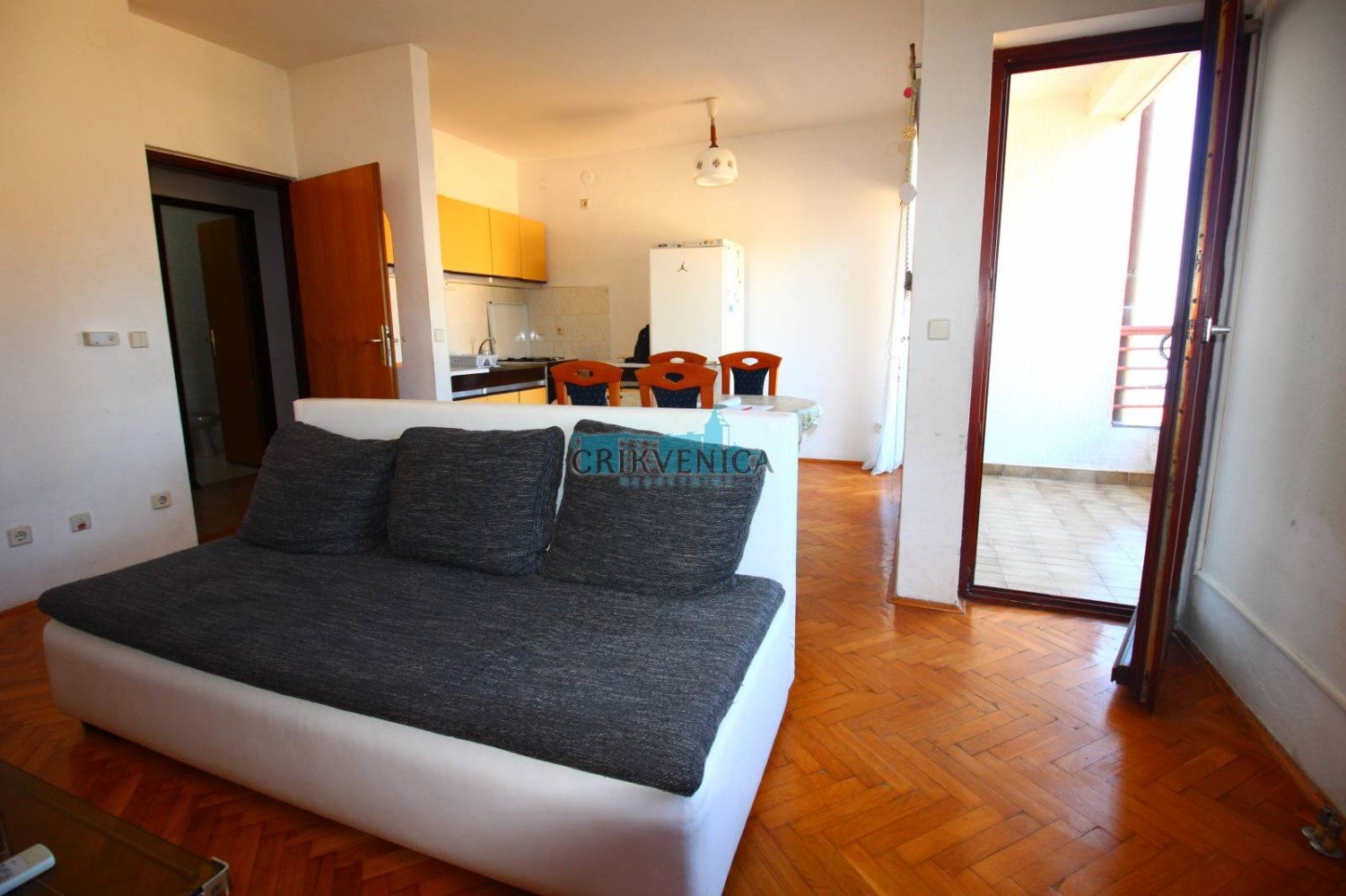 Eine Wohnung mit praktischer Aufteilung zum Verkauf im 3. Stock eines Gebäudes, das etwa zehn Minuten zu Fuß vom Meer entfernt liegt. Es besteht aus einem Wohnzimmer mit Küche, einem Schlafzimmer, Bad, Flur und Balkon mit offenem Panoramablick auf das Meer und die Umgebung.