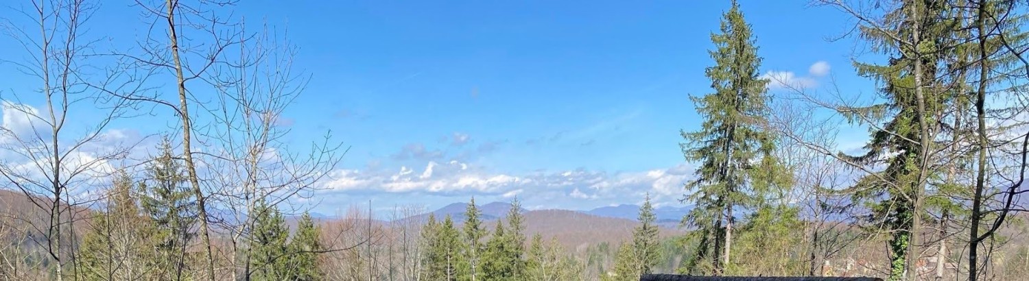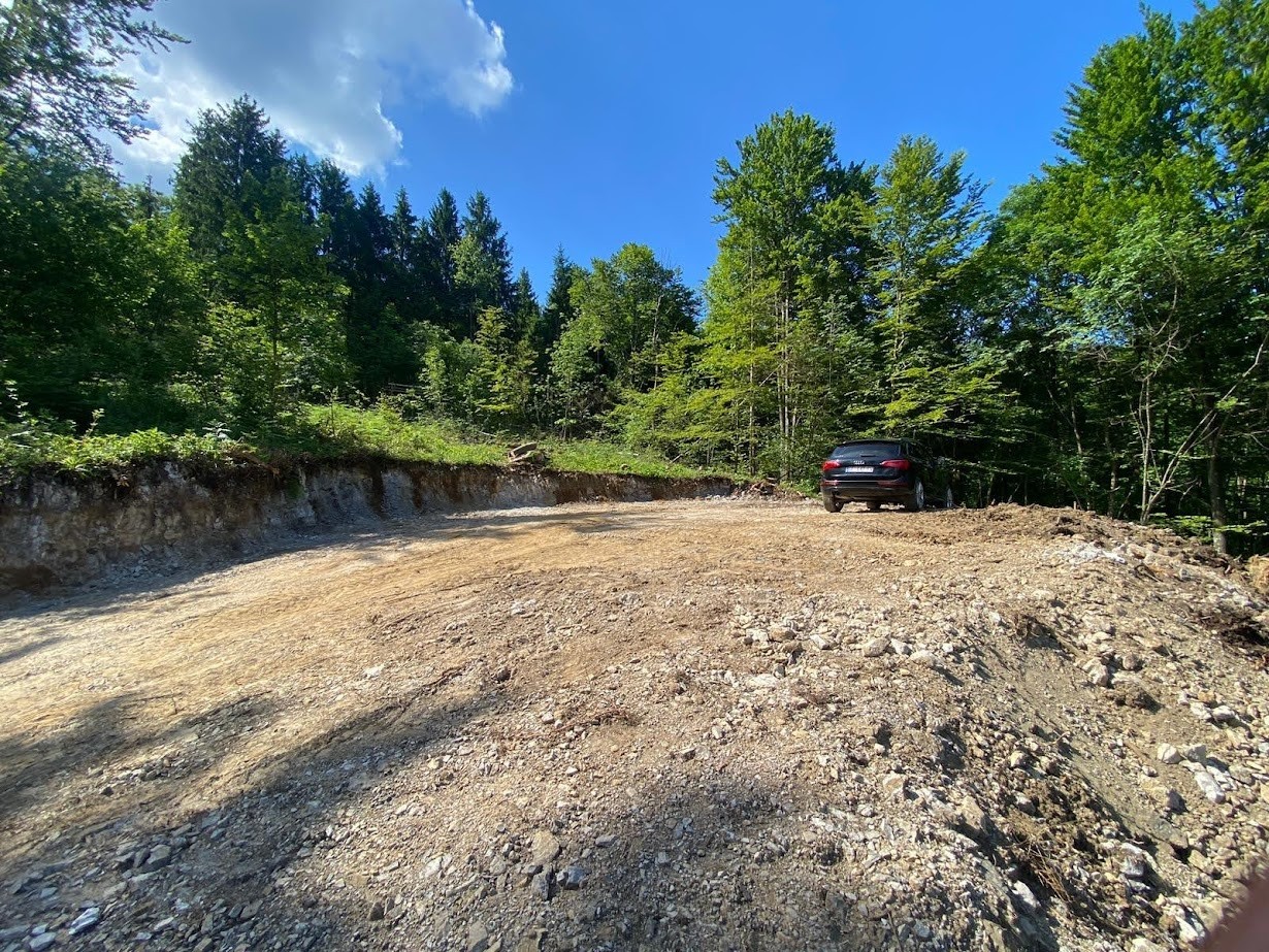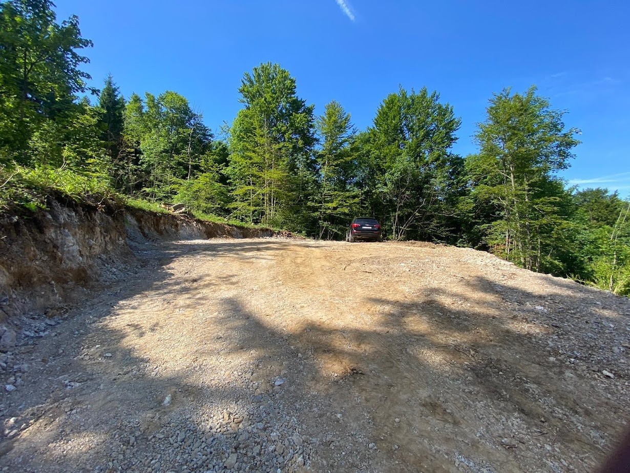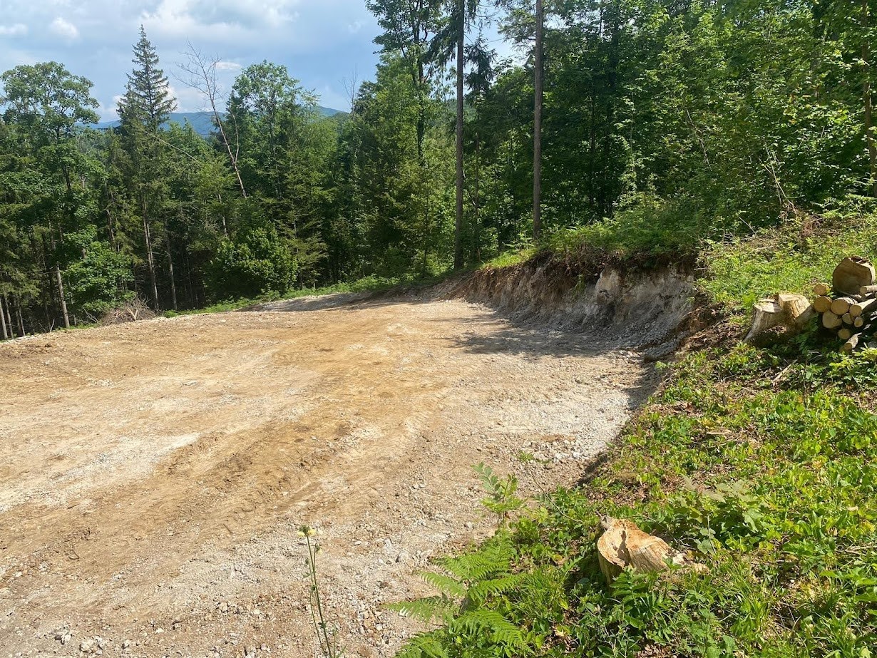 Das Grundstück ist gerodet und bereit für den Bau, mit einer Zufahrtsstraße und herrlichem Blick auf die Waldlandschaft.