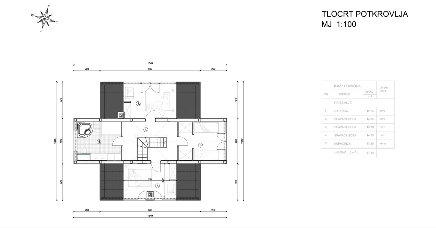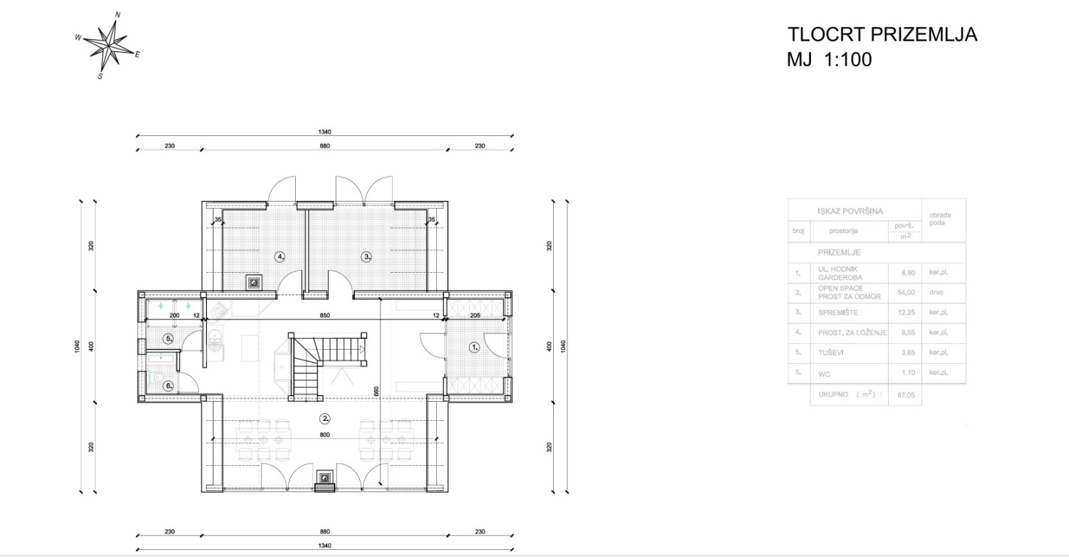 ✔ Erdgeschoss – funktionaler Bereich für Forstarbeiter, einschließlich Umkleideraum, Sanitäranlagen mit Duschen, kleine Küche und Essbereich, Heizraum und Lager.