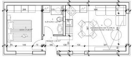 Das Apartment mit einer Fläche von 37,40 m² besteht aus einem Flur, Schlafzimmer, Badezimmer, Wohnzimmer mit Küche und Essbereich.