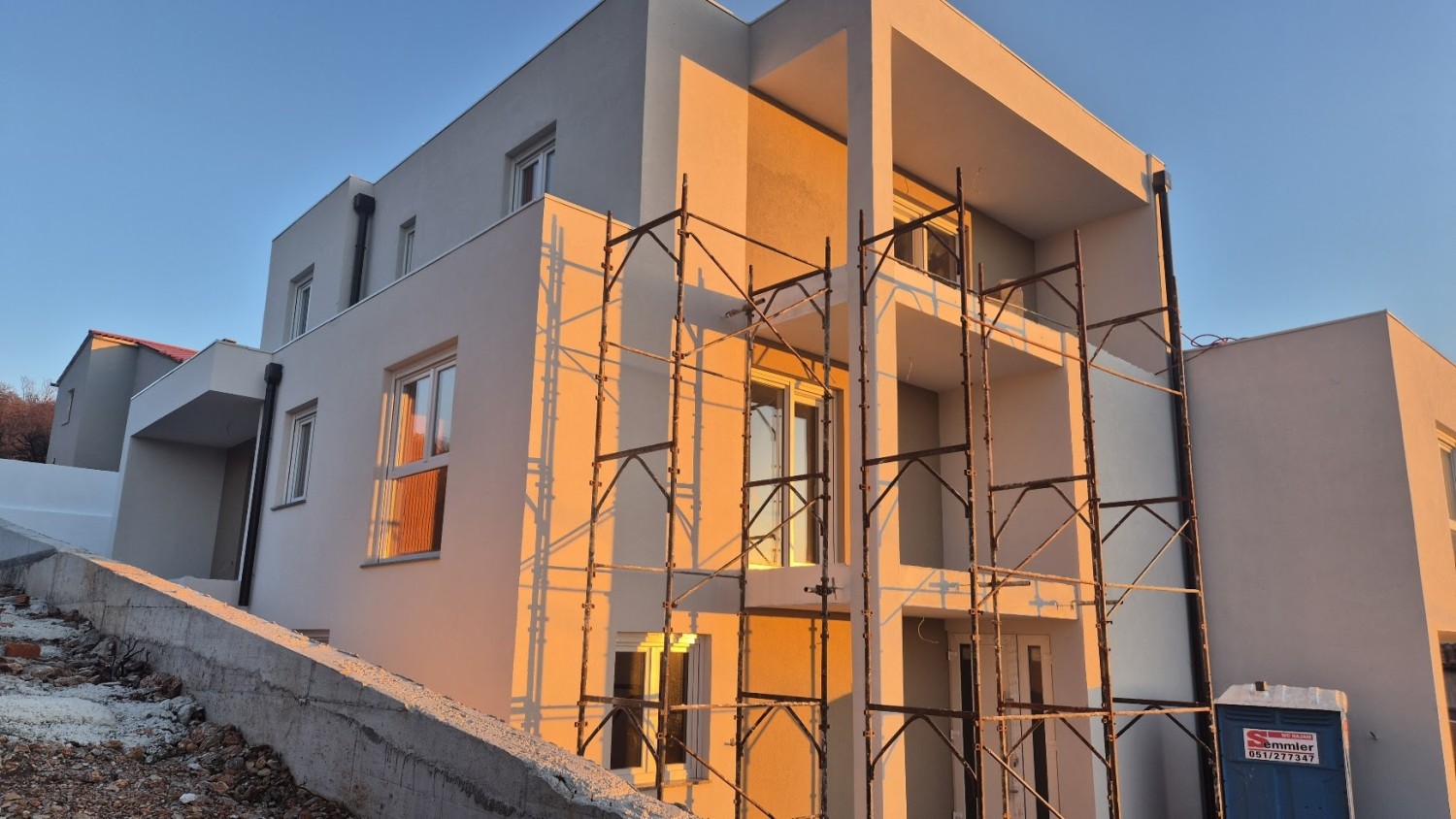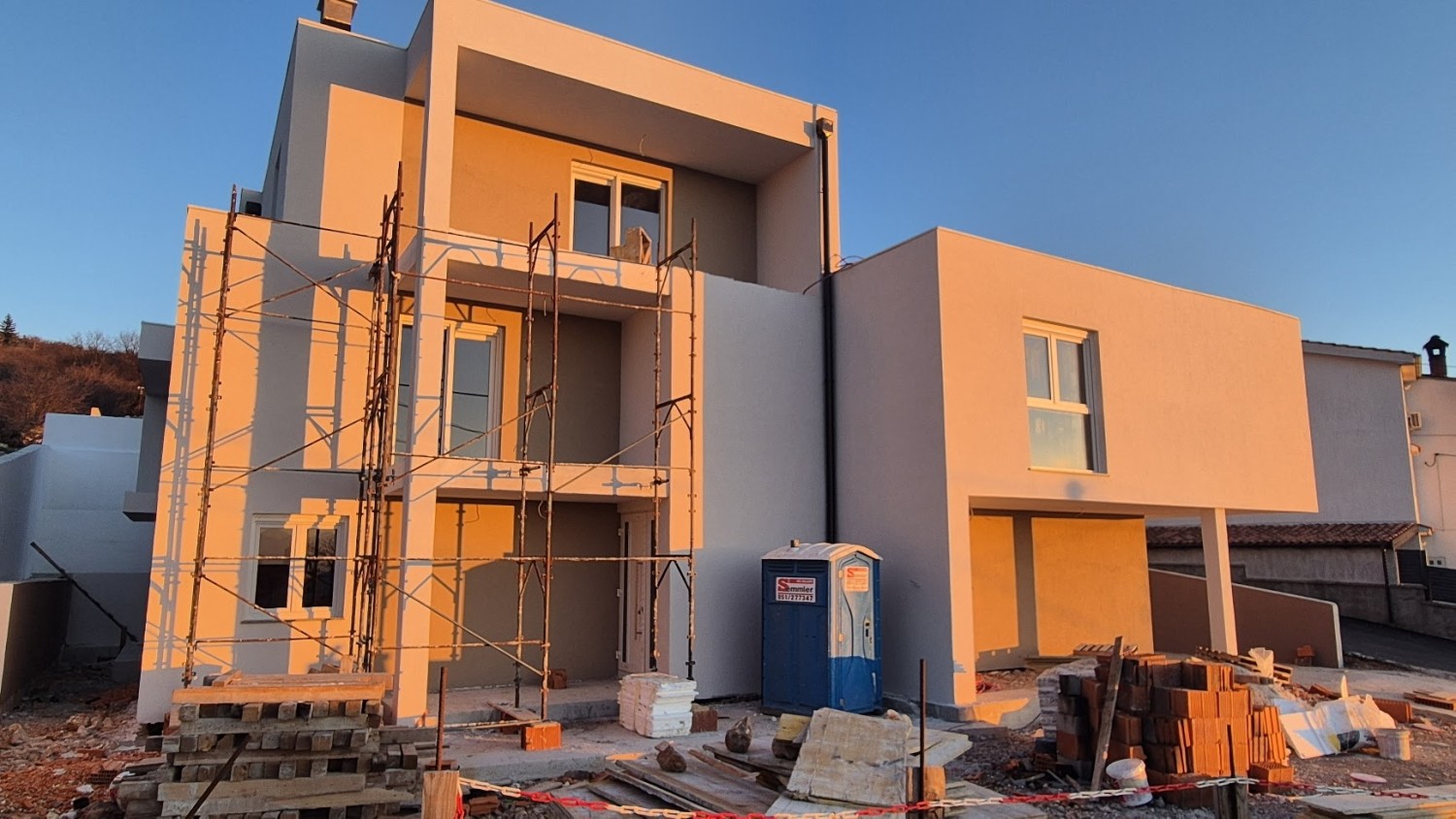 Der Bau erfolgt mit hochwertigen und bewährten Materialien: Porotherm Profi S Ziegel, 10 cm Wärmedämmfassade, Alu-Ben Aluminium-PVC-Fenster und -Türen, Dierre Sicherheitseingangstür sowie Braga Innentüren. Heizung und Kühlung erfolgen über Hisense Split-Klimasysteme, während der Innenraum mit Kronotex Mammut Laminat (12 mm), hochwertiger Keramik und Sanitäranlagen von Geberit ausgestattet wird.