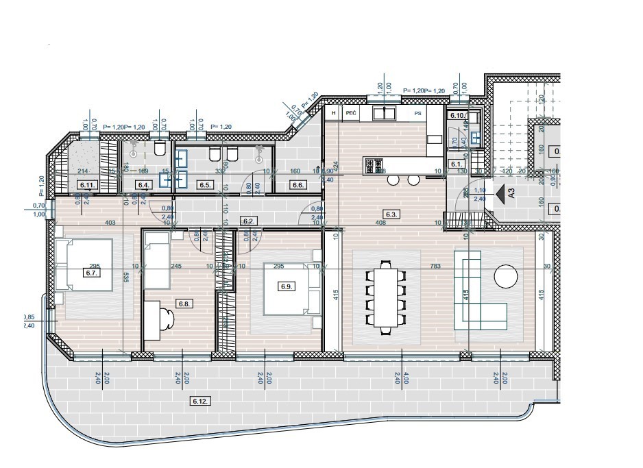 Die Wohnung A3 befindet sich im 1. Stock eines Wohnhauses und besteht aus einem Flur, Wohnzimmer und Küche, drei Schlafzimmern (Hauptschlafzimmer mit eigenem Bad und Garderobe), Abstellraum, einem weiteren Flur, Bad, WC und einer großen Terrasse.