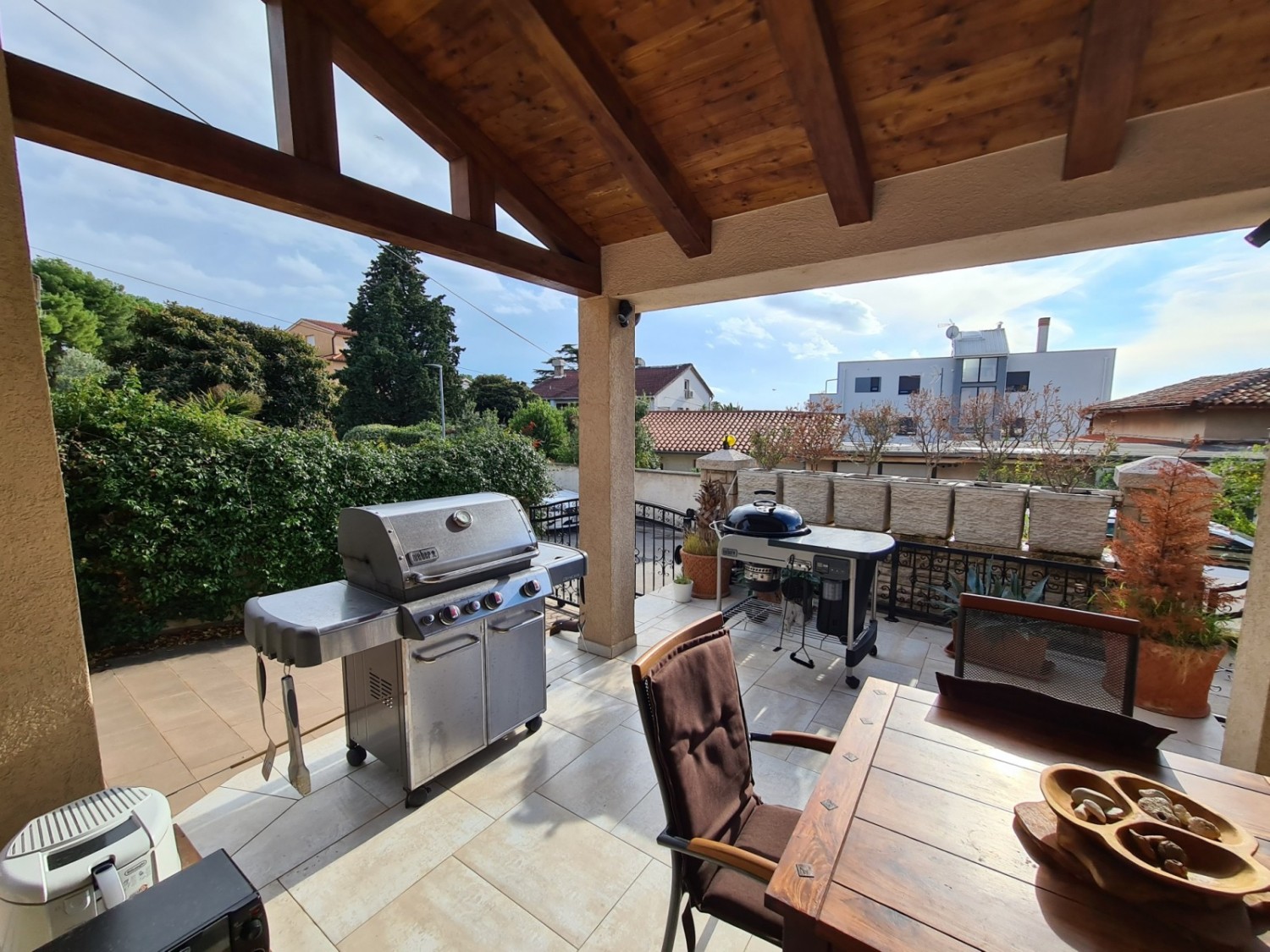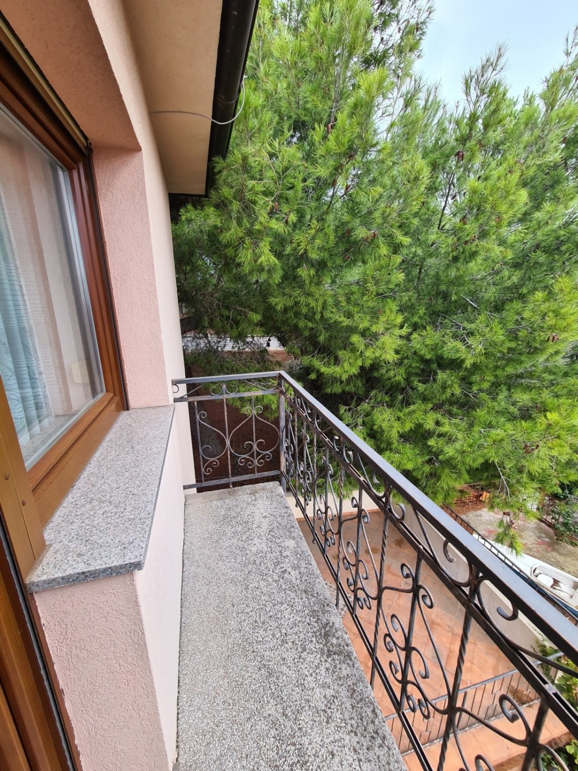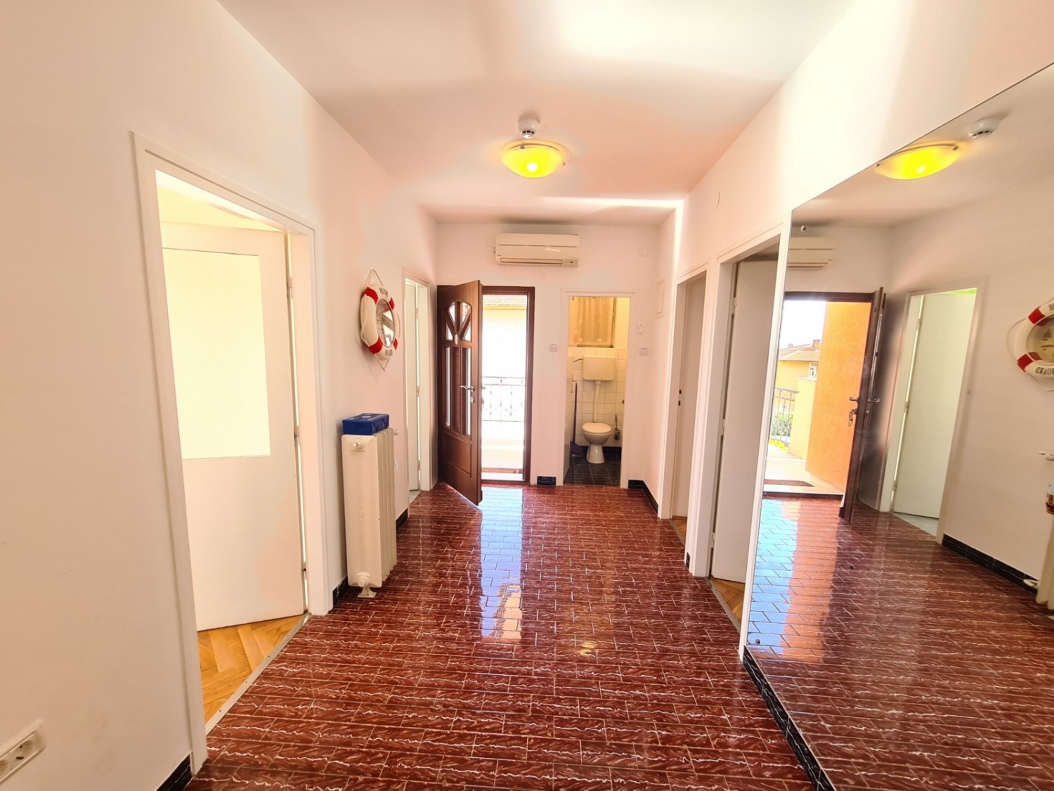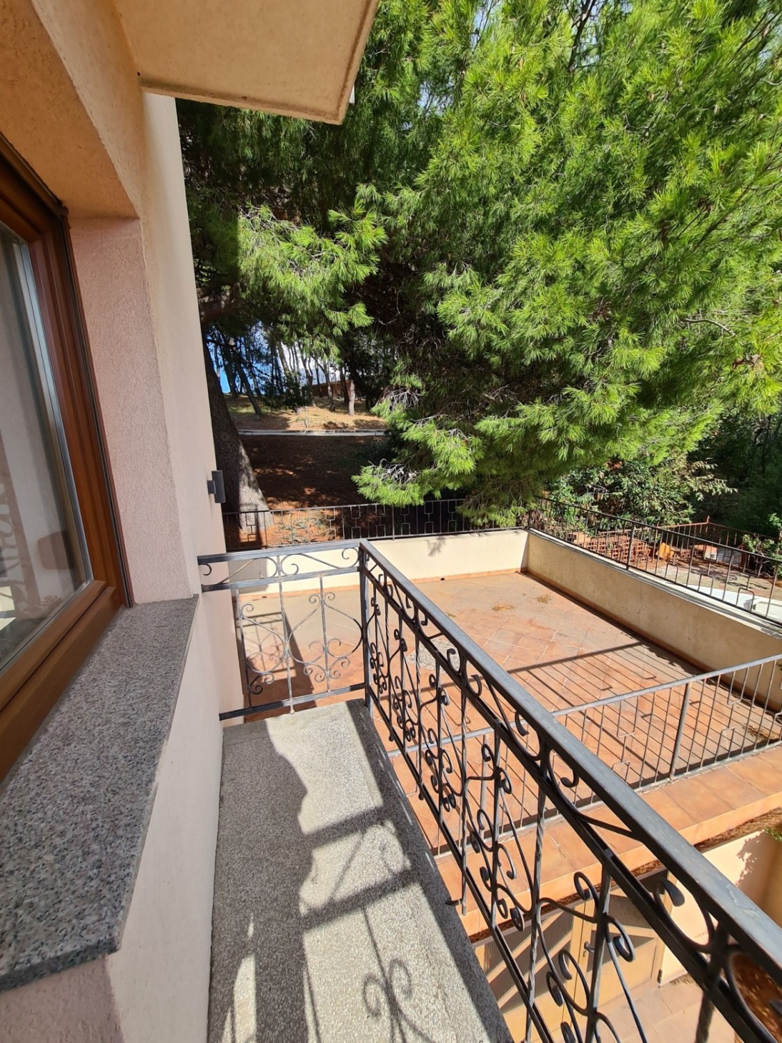 Außenstufen führen in die 1. Etage, wo sich eine Wohnung von 157 m² mit zwei Schlafzimmern (eines mit Terrasse), Toilette, Badezimmer, Küche mit Essbereich und einem geräumigen Wohnzimmer befindet. Vom Wohnzimmer aus gelangt man auf eine Terrasse von 15 m².