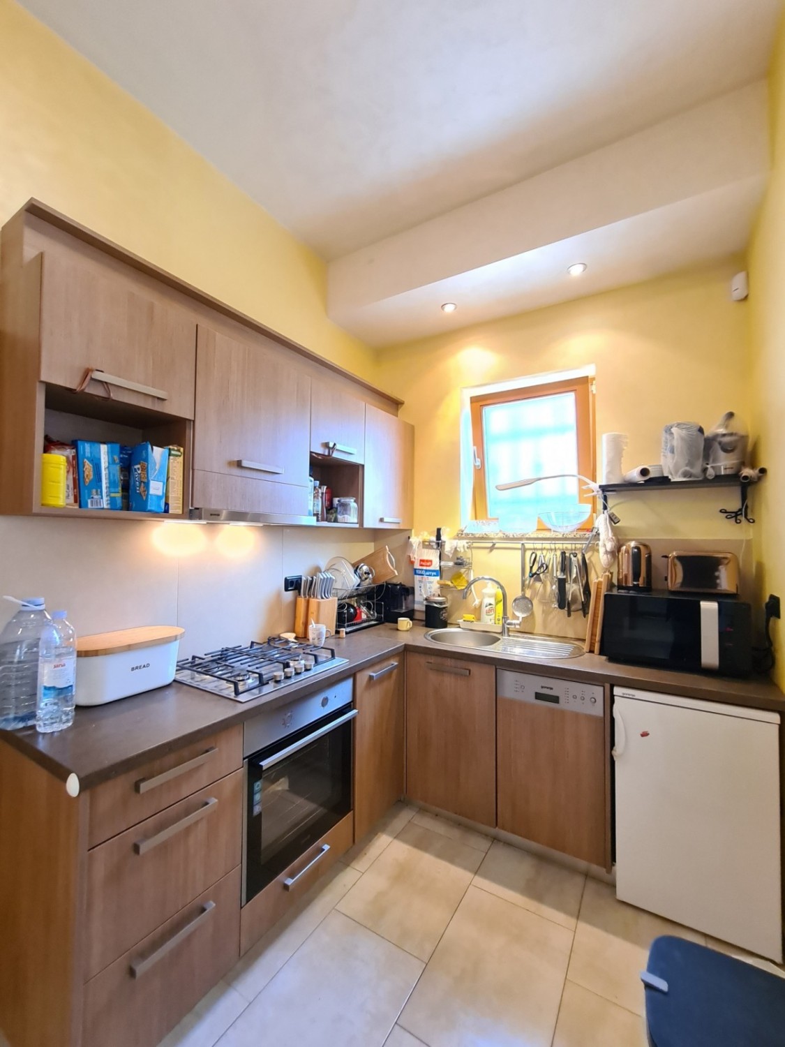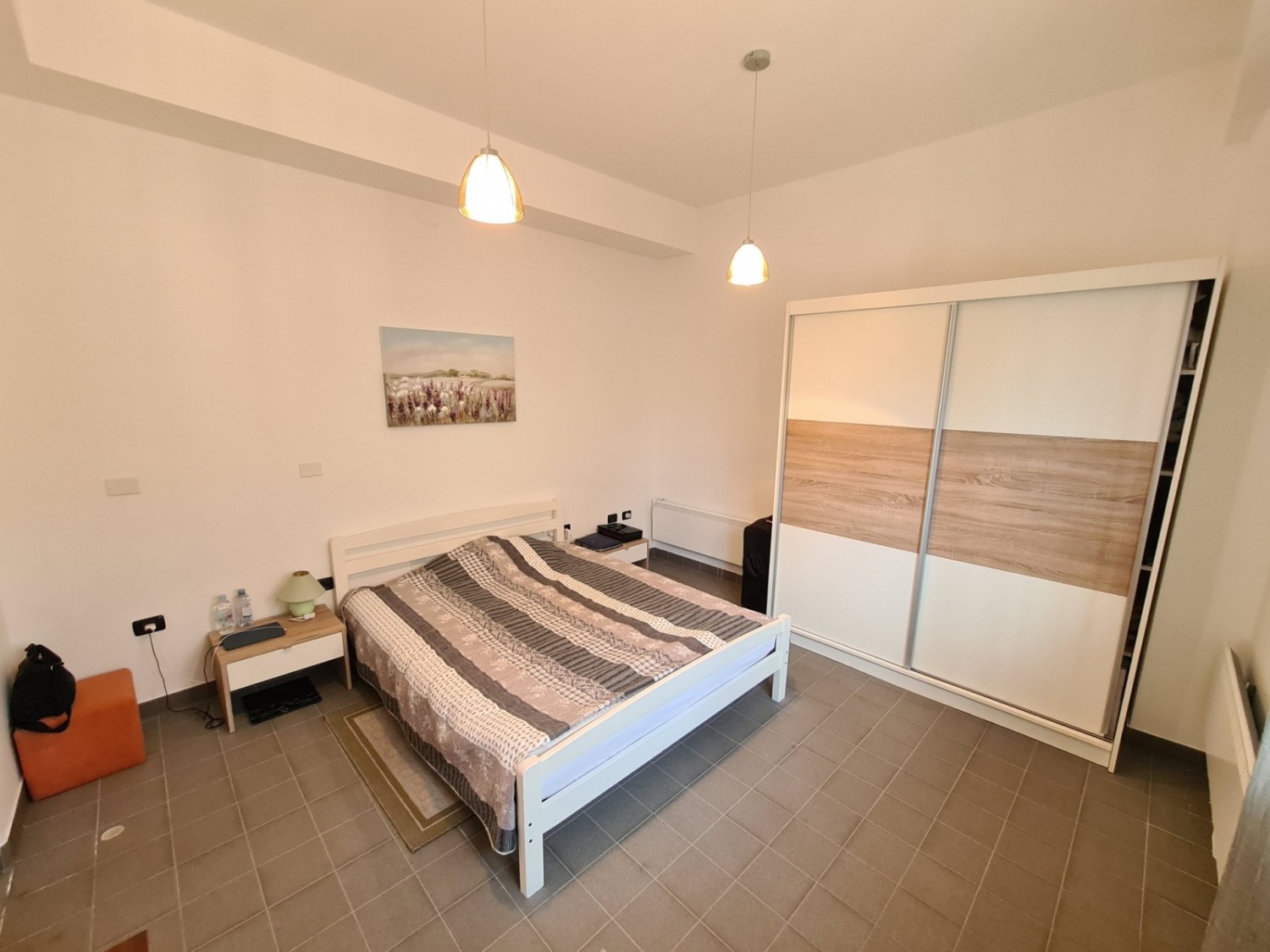Im Erdgeschoss befindet sich eine Wohnung von 128 m², die aus einem geräumigen Wohnzimmer mit Essbereich, Küche, zwei Schlafzimmern sowie einem Badezimmer und einer Toilette besteht, sowie einem kleineren Abstellraum in der Wohnung.