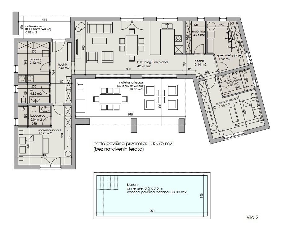 Geplante Villa: 129 m² Wohnfläche, 38 m² überdachte Terrasse und 8 m² überdachter Eingang