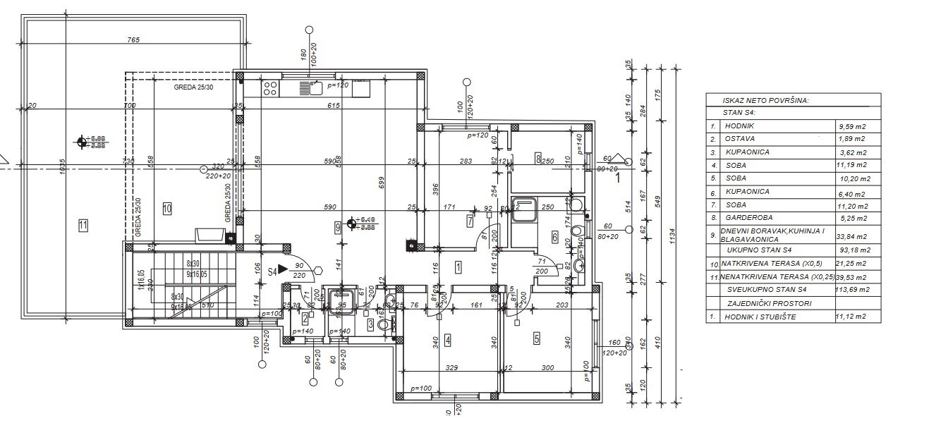 Besonderes Augenmerk wurde auf die Isolation gelegt, was die Bodenschichten zwischen den Etagen mit einer Dicke von 18 cm (Wärmedämmung + Estrich + Fliesen/Parkett) umfasst, 20 cm beträgt die Dicke des Betons und 10 cm die Dicke der abgehängten Decke. Zwischen den Wohnungen beträgt die Dicke der Boden-/Deckenlagen 48 cm, die eine ausgezeichnete Schall- und Wärmeisolierung der Wohnungen im Gebäude bieten.