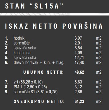 Die Wohnung mit der Bezeichnung 15A, mit einer Nutzfläche von 49,62 m², befindet sich im Erdgeschoss des Gebäudes und besteht aus: Flur, Wohnzimmer mit Küche und Essbereich, 2 Schlafzimmer, Badezimmer, Abstellraum und Garten.