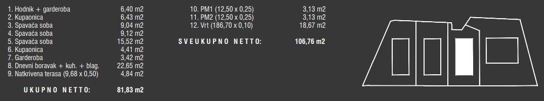 Die Wohnung besteht aus einem Eingangsflur, einer Garderobe, einem Wohnzimmer mit Küche und Essbereich, 3 Schlafzimmern, 2 Badezimmern und einem Garten von 186,70 m² (18,67 m²).