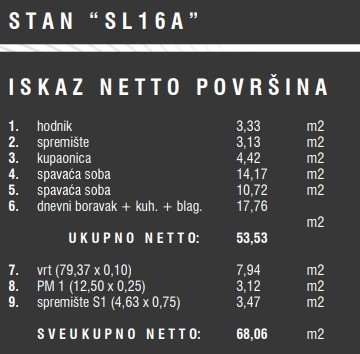Die Wohnung mit der Kennung 16A hat eine Nutzfläche von 68,06 m², befindet sich im Erdgeschoss des Gebäudes und besteht aus: Flur, Wohnzimmer mit Küche und Essbereich, 2 Schlafzimmern, Badezimmer, Abstellraum und Garten.
