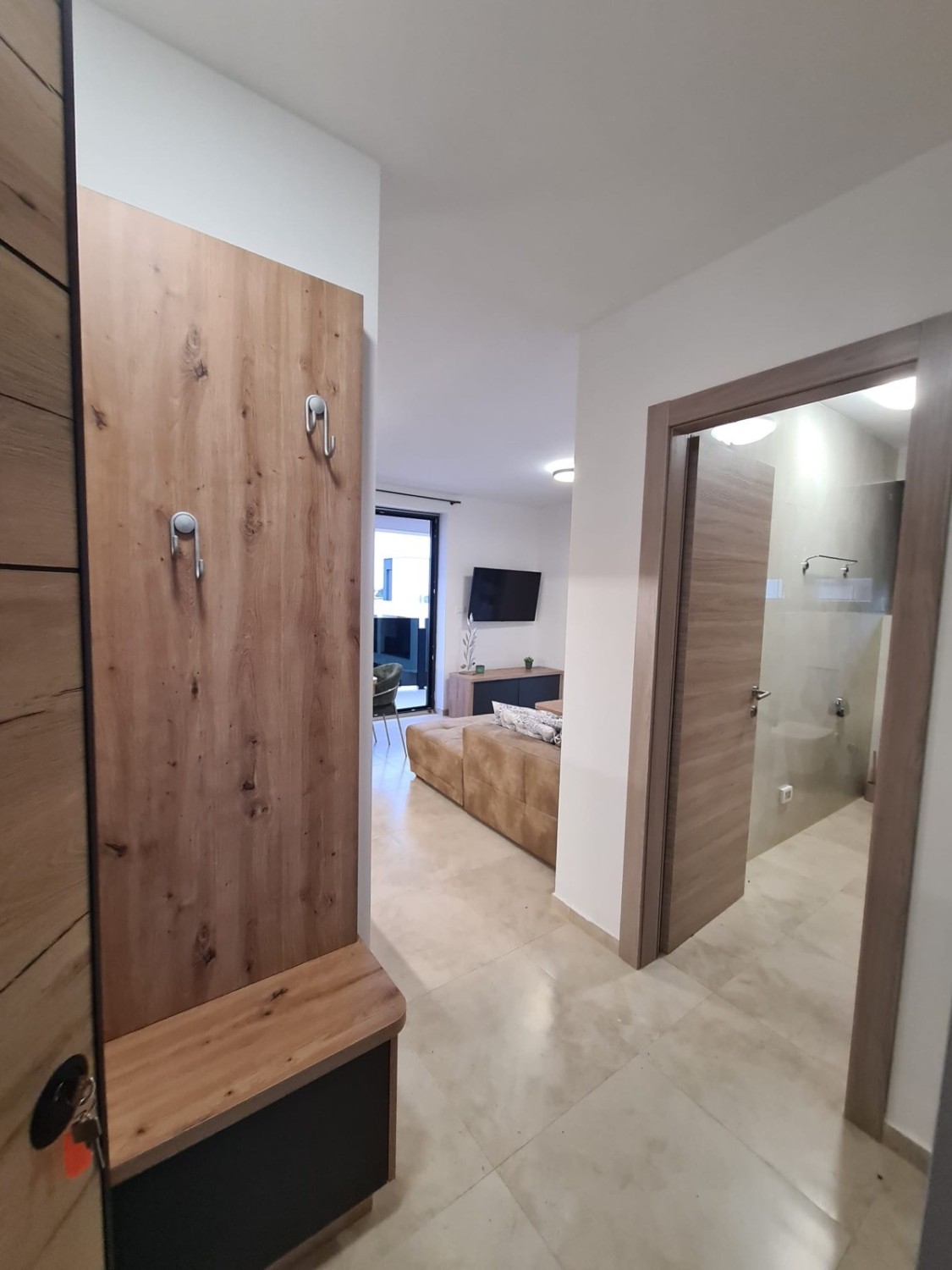 Im Angebot ist die Wohnung E5 im zweiten Stock, mit funktionalem Grundriss, der einen Flur mit Garderobe, zwei Schlafzimmer, ein Badezimmer, ein Wohnzimmer mit Küche und Essbereich sowie eine überdachte Terrasse umfasst. Die Nettofläche der Wohnung beträgt 59,26 m², und es gehört ein Parkplatz mit der Bezeichnung E6 mit einer Fläche von 3,12 m² dazu, sodass die gesamte netto berechnete Quadratmeterzahl 62,38 m² beträgt.