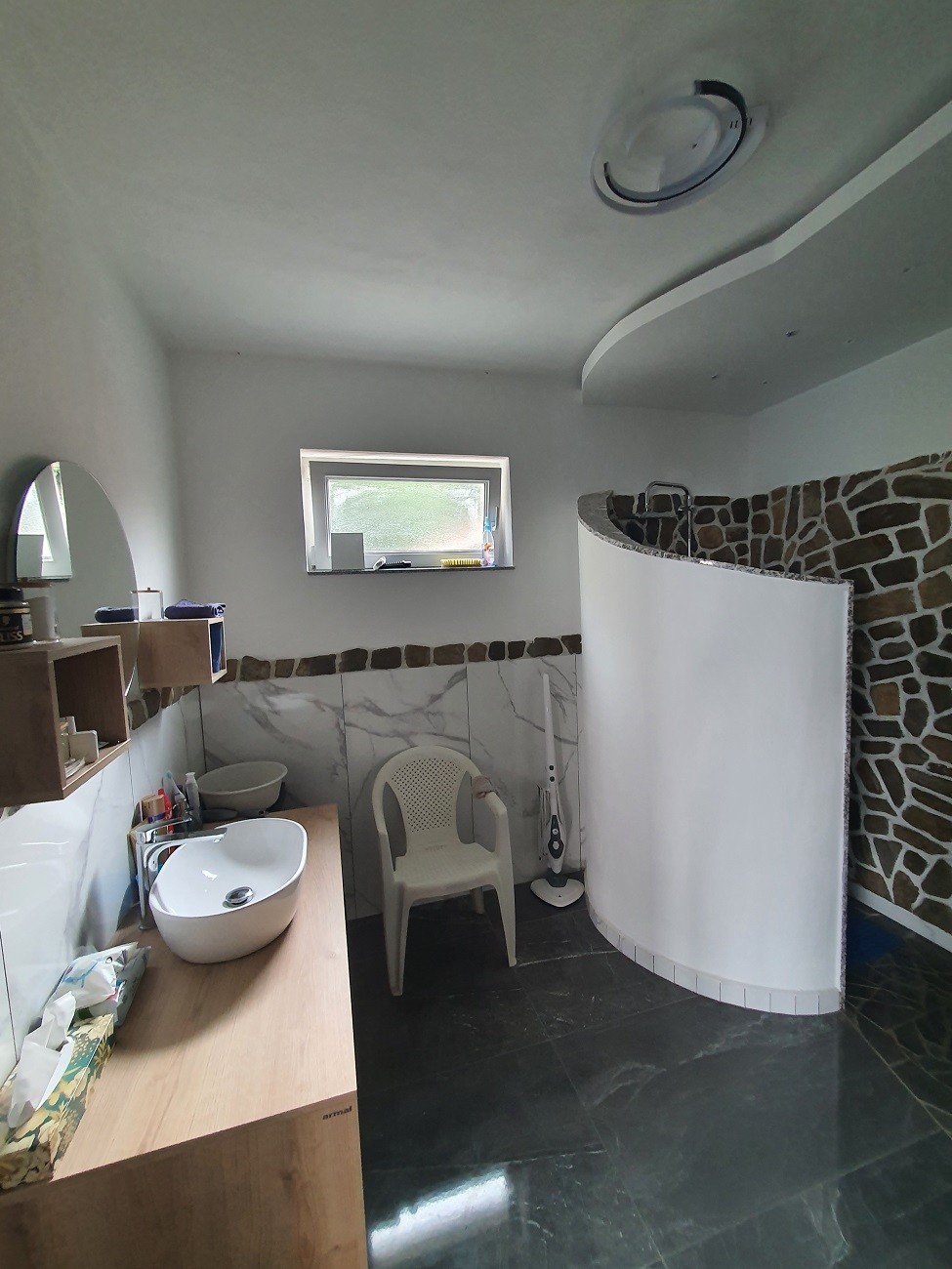 Downstairs in the apartment there is a huge living room and kitchen with access to the terrace with a beautiful view of the sea, one bedroom, a separate toilet and a separate bathroom, and on the upper floor there is a bedroom with a bathroom.