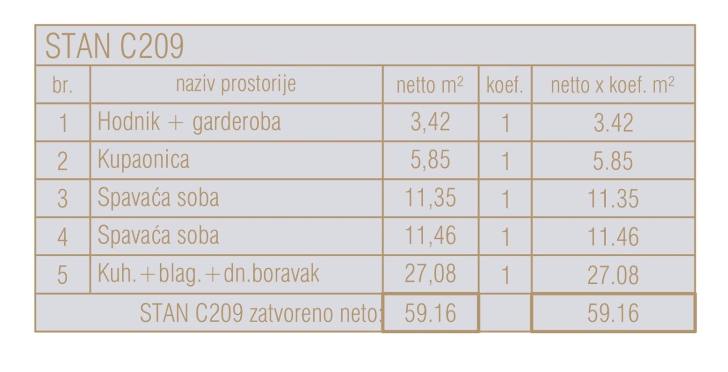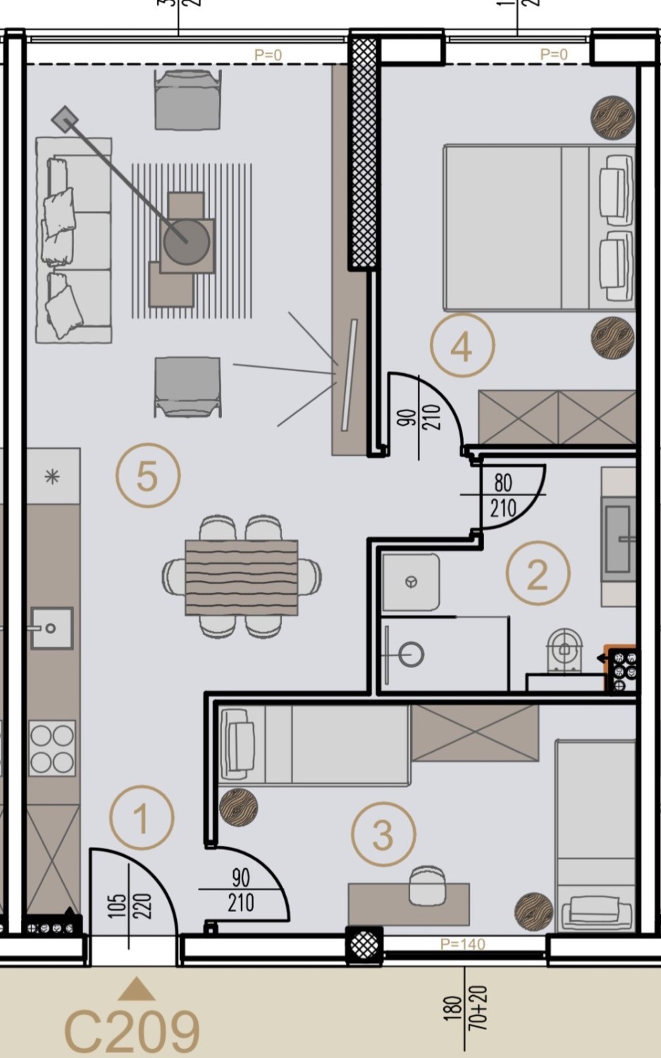 Apartment C209 is located on the second floor of the central building and consists of: hallway + wardrobe, living room with kitchen and dining room, 2 bedrooms and bathroom.