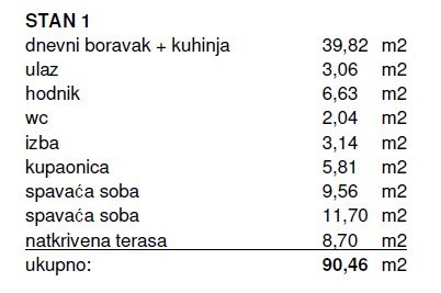 Apartment A1, 90.46 m2, is located on the ground floor of the building and consists of the following rooms: living room + kitchen, hallway, bedroom, toilet, bathroom, two bedrooms, covered terrace.