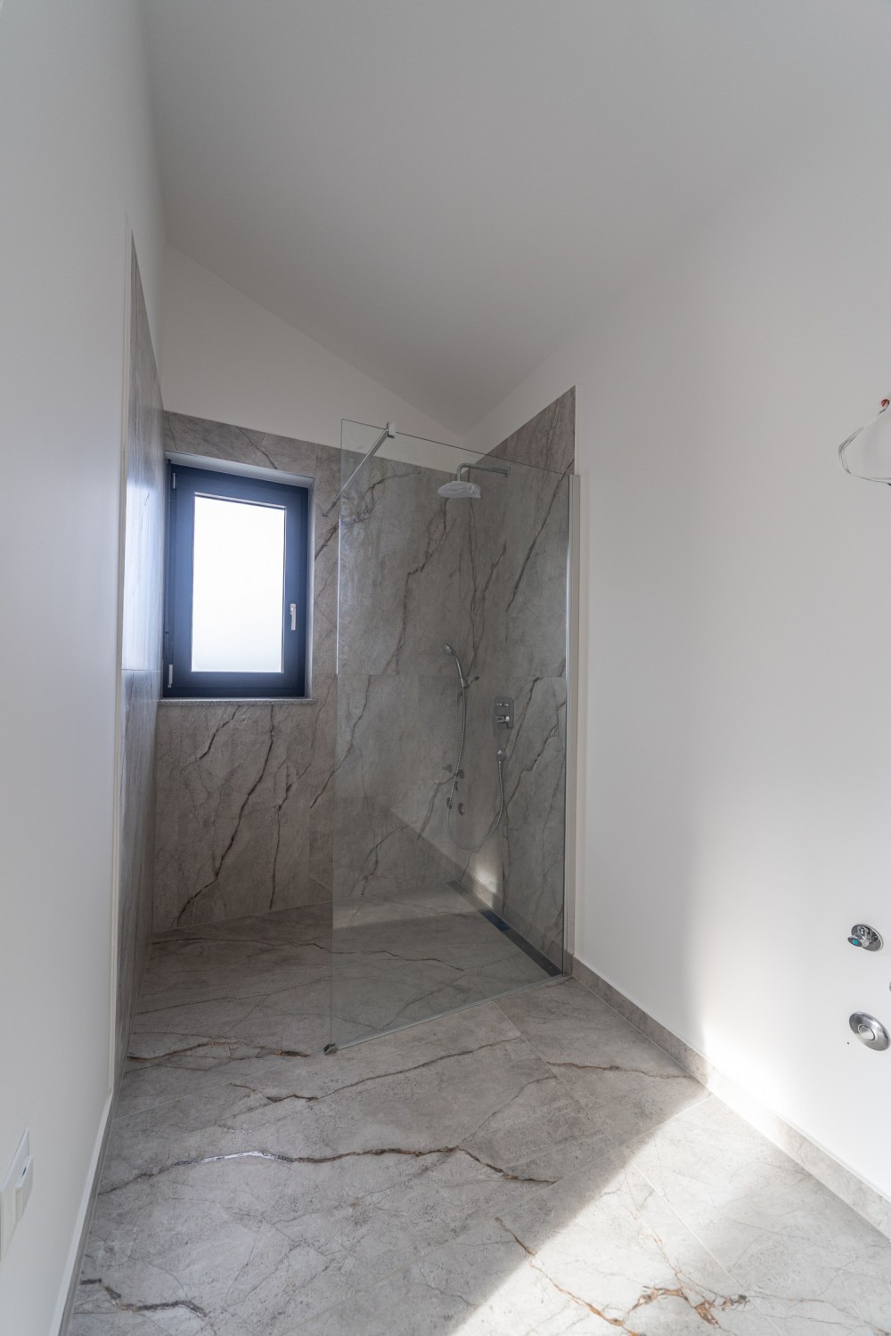 Exterior PVC joinery with aluminum shutters in anthracite color.