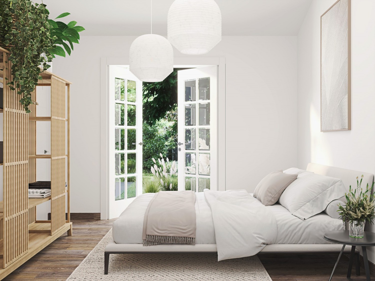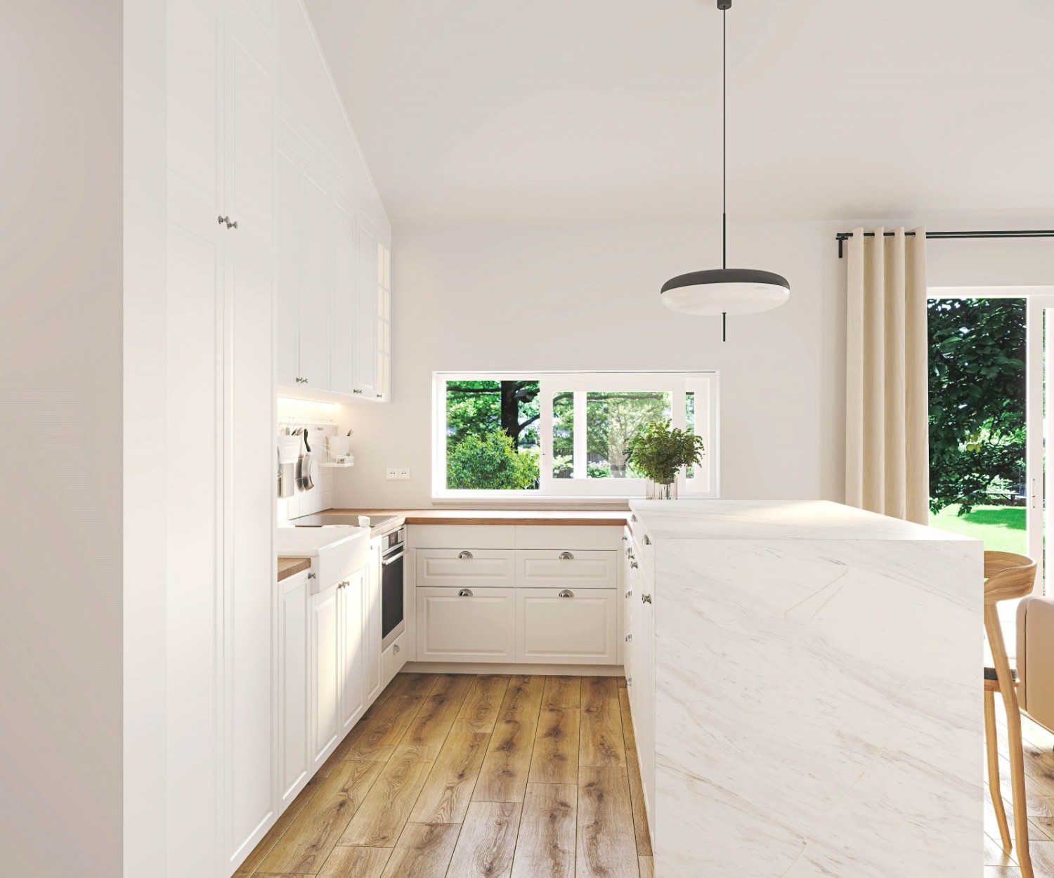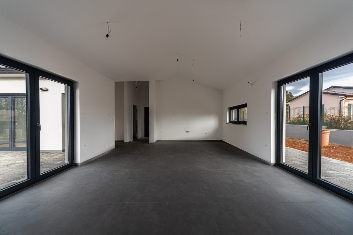 Open-concept living room, dining area, and kitchen with access to a terrace and garden.