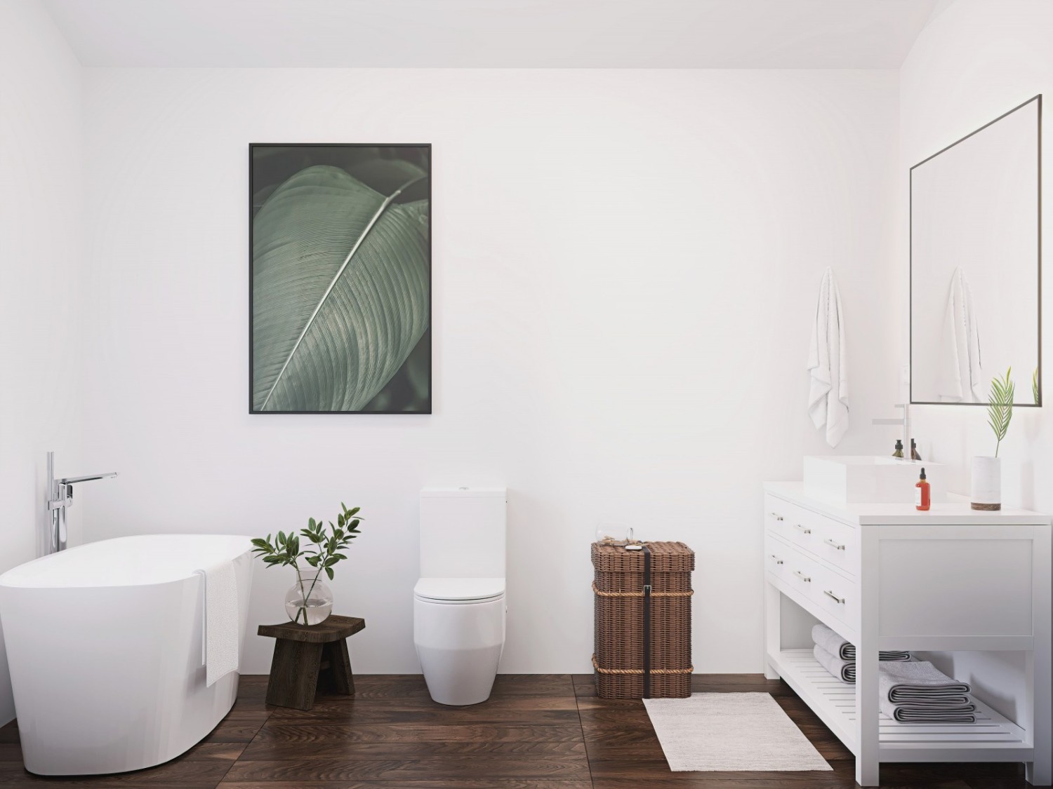 Two bedrooms (one with its own bathroom), an additional bathroom, and a laundry/storage room.