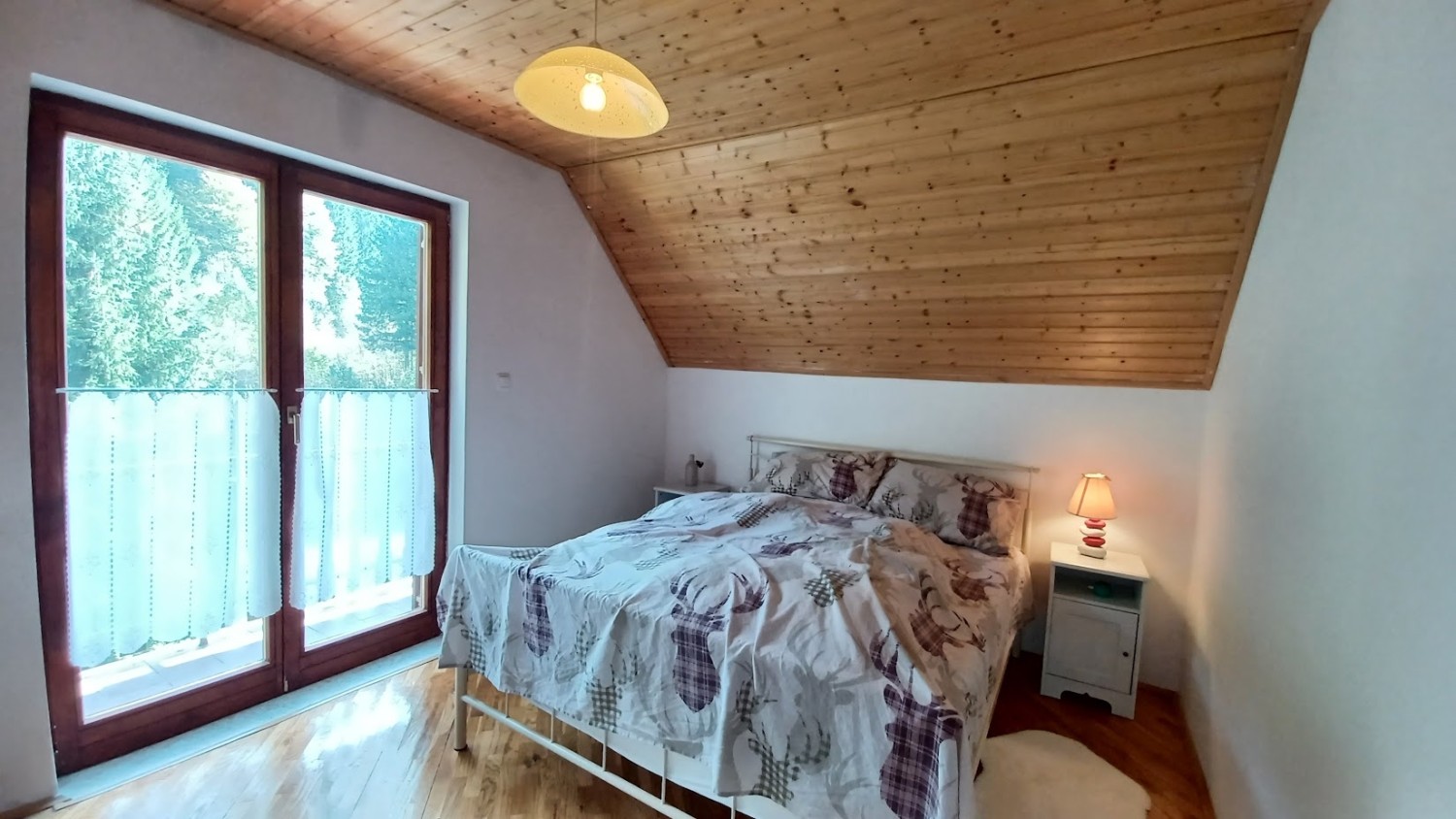 The house consists of a ground floor, upper floor, and a high attic, with a floor plan of 86 m². Every square meter inside the house has been cleverly utilized. On the ground floor, there is a tavern for socializing and relaxation, a small functional kitchen, two storage rooms, and a wood-burning stove for central heating. An internal staircase provides access to the upper floor. The upper floor has a separate external entrance and a covered terrace on the south side of the house to enjoy the view of the forest and greenery. It includes a living and dining area, a kitchen with an additional fireplace not connected to the central heating, creating a true mountain atmosphere with the crackling fire. On this floor, there are two bedrooms, a bathroom, a spacious hallway, and a small room that serves as a wardrobe.