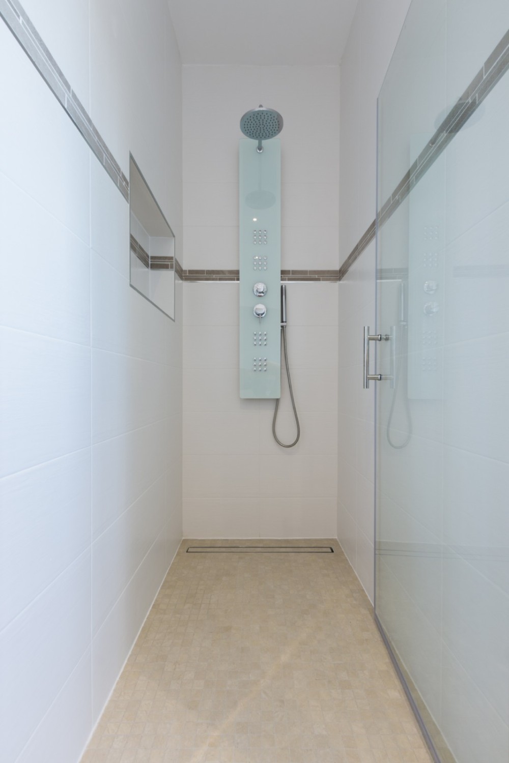 Layout: hallway, large living room and kitchen with access to the terrace. Two bedrooms, two bathrooms. The larger bedroom has three beds, a double bed and a bed for 1 person. Large terrace 22m2.