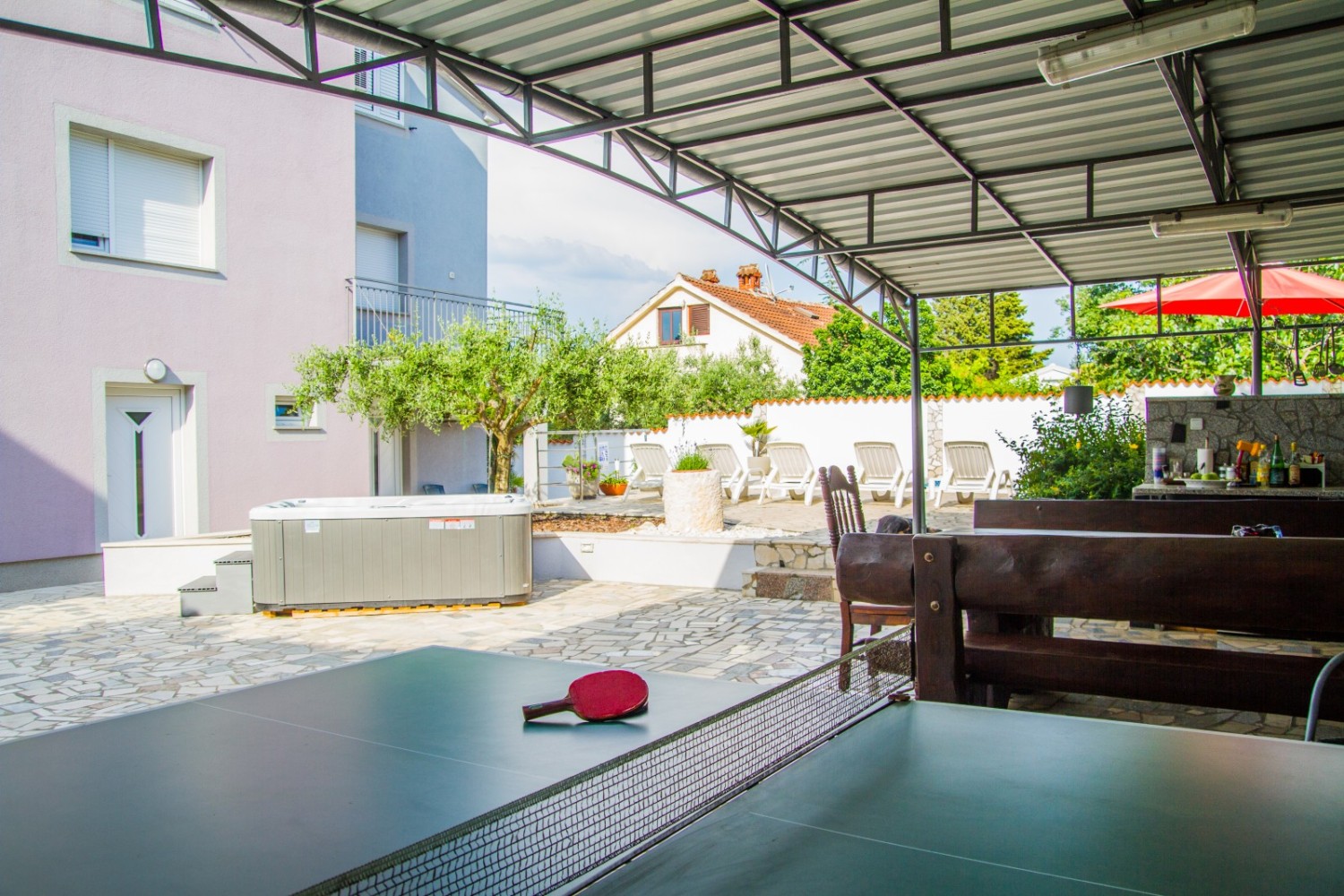 The landscaped yard of 570 m² includes a swimming pool, jacuzzi, sunbathing area, barbecue, and garden furniture, ideal for relaxation and enjoyment during the warm summer months. The house is additionally equipped with a sauna, gym (currently repurposed as a storage room), and billiards.