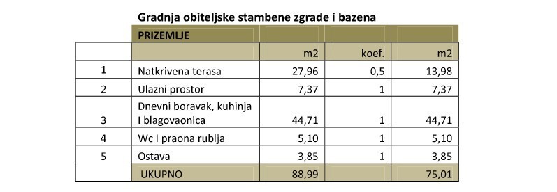 The house consists on the ground floor (area 88.99 m2, net 75.01 m2) of: entrance area, living room, kitchen, dining room, toilet, storage room and covered terrace.