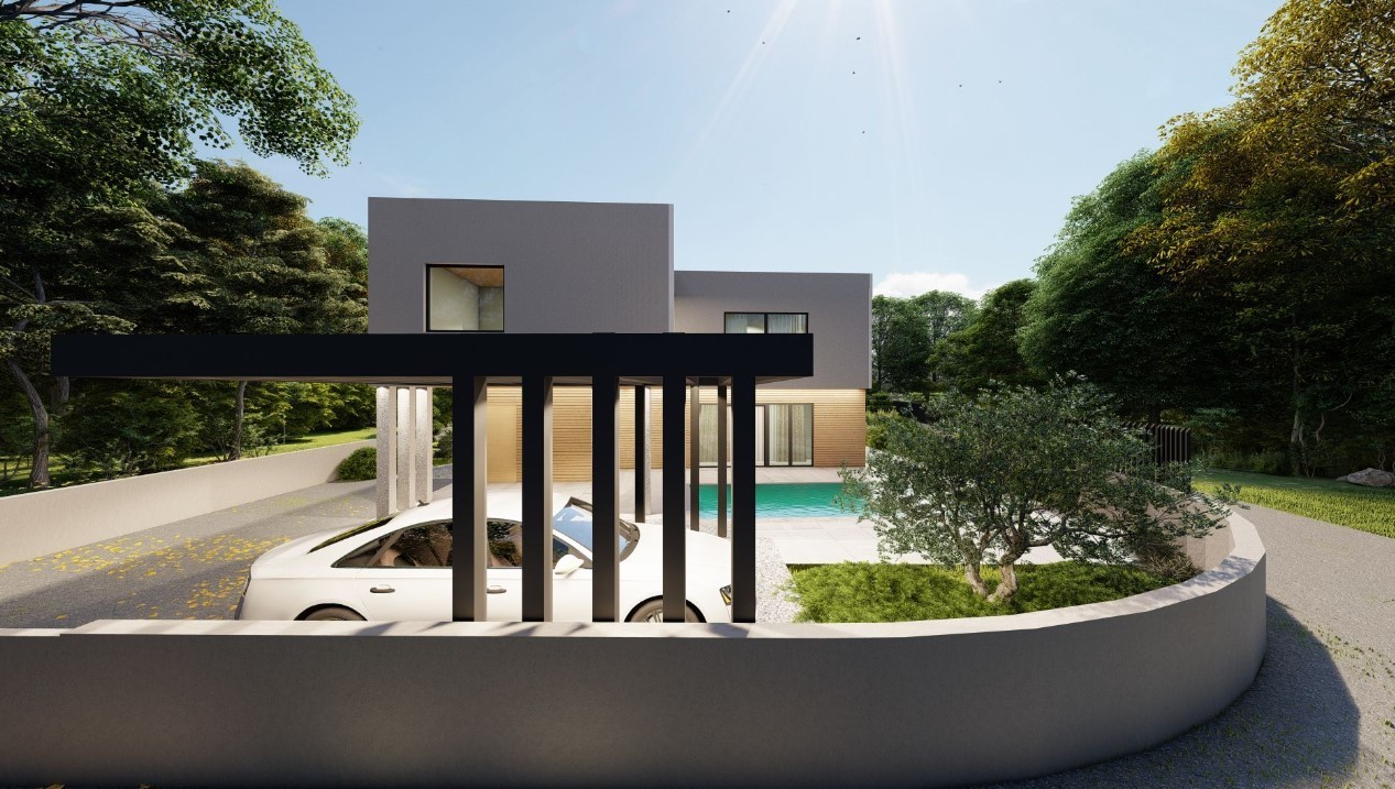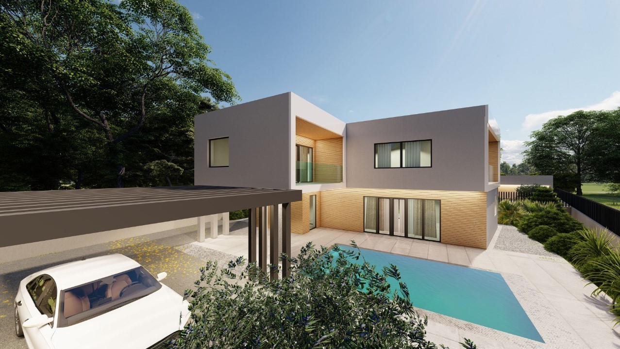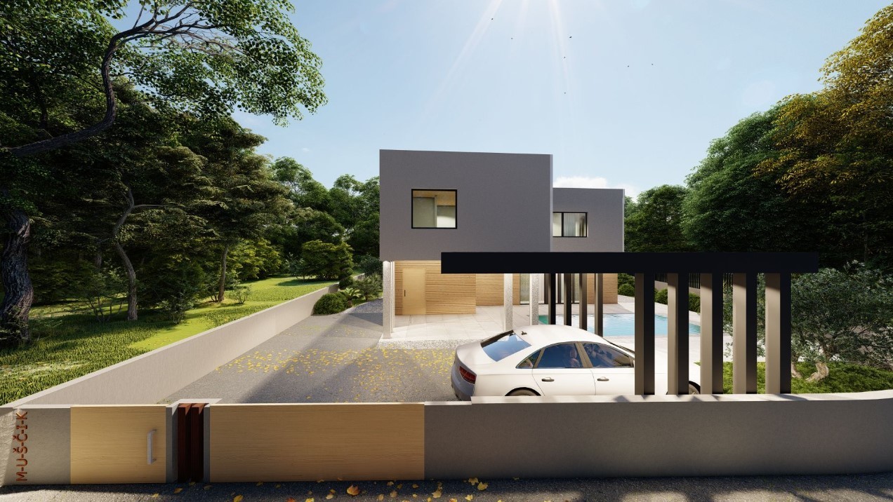 A house under construction, with a view of the sea in Pomer, is for sale. The surface of the house is 190 m2, it consists of 2 floors (ground floor + floor).