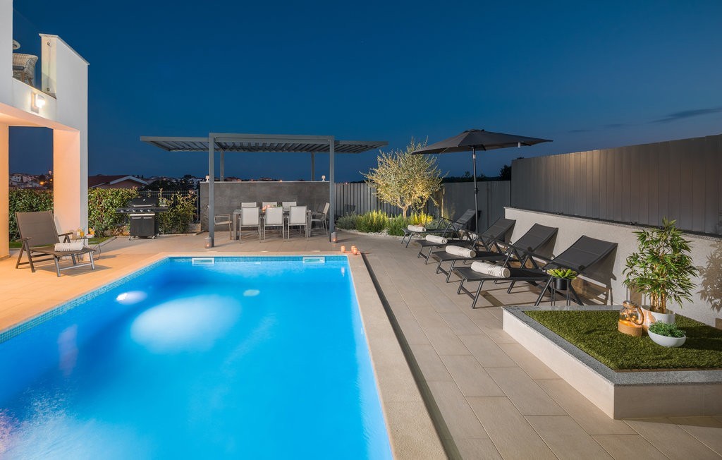 Luxury villa in Medulin with sea view and swimming pool! The house has 4 bedrooms and 4 bathrooms, 260 m2 of living space and a plot of 570 m2.