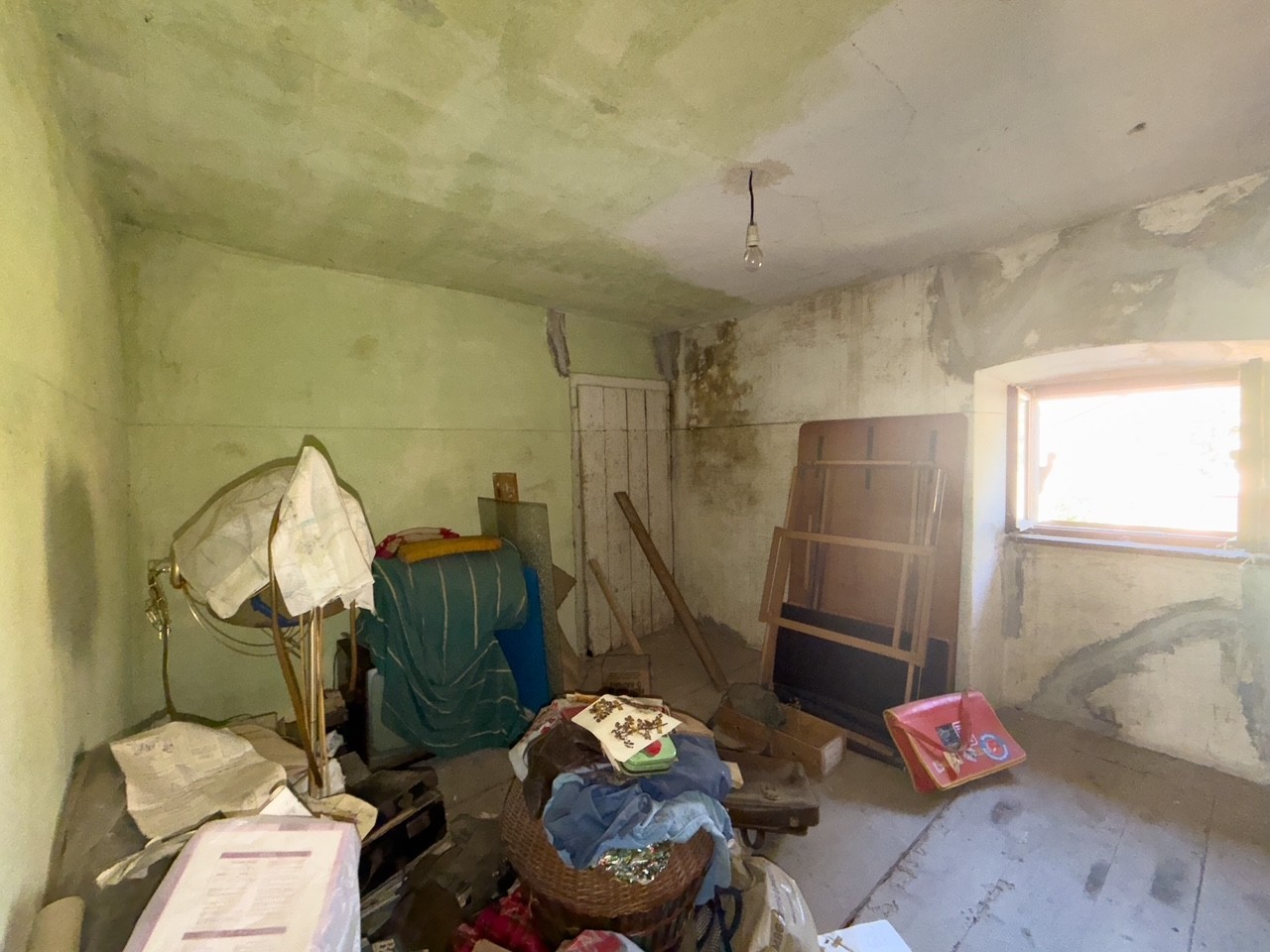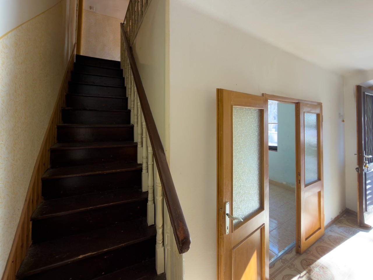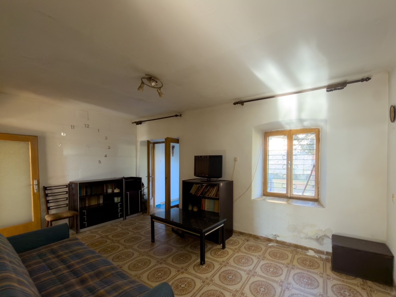 The house is located in a quiet area with a view of the park on one side and the bell tower of the Vodnjan church on the other side. The ground floor consists of a dining room, kitchen, bathroom, and living room, which leads out to the garden. There is also a garage on the ground floor, which has direct access to the house and an exit to the garden. The first and second floors each have two bedrooms, and the third floor has an attic. The roof was replaced ten years ago. The rest of the house requires renovation.