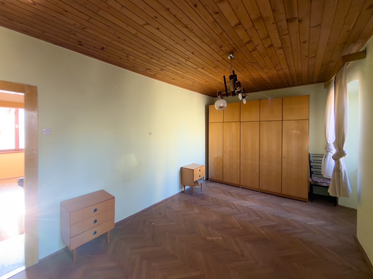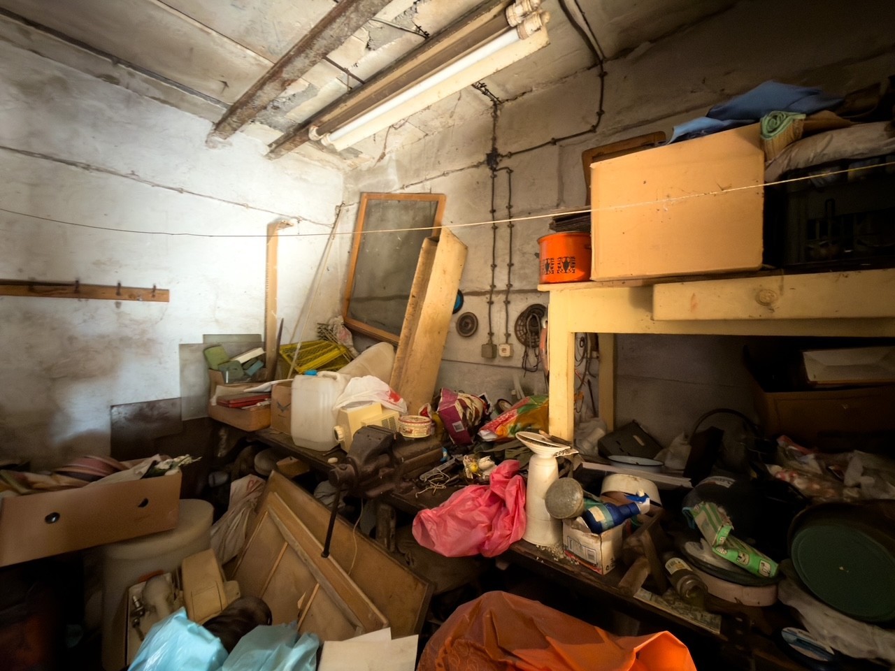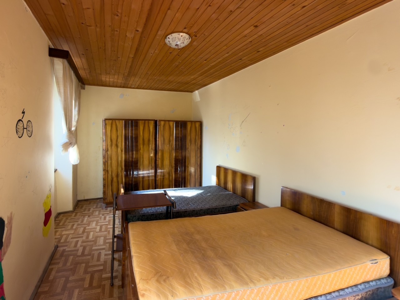 The house is located in a quiet area with a view of the park on one side and the bell tower of the Vodnjan church on the other side. The ground floor consists of a dining room, kitchen, bathroom, and living room, which leads out to the garden. There is also a garage on the ground floor, which has direct access to the house and an exit to the garden. The first and second floors each have two bedrooms, and the third floor has an attic. The roof was replaced ten years ago. The rest of the house requires renovation.