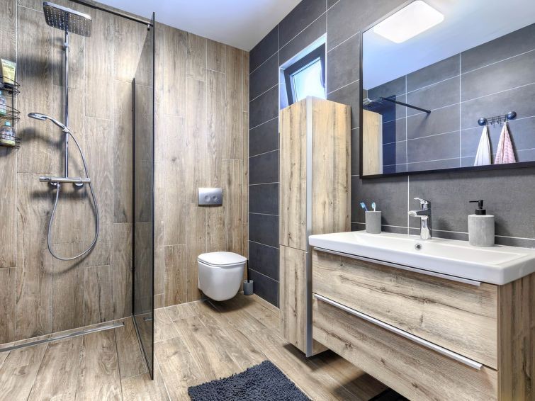 On the first floor there are three comfortable bedrooms, two modern bathrooms and a covered terrace that provides a pleasant space for relaxation with a view of nature.