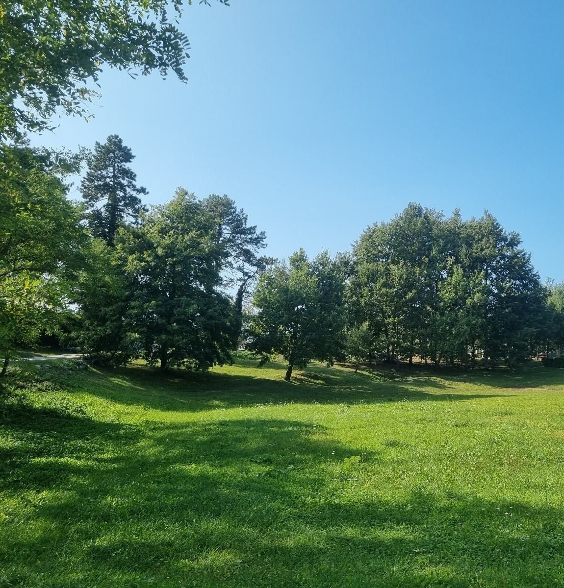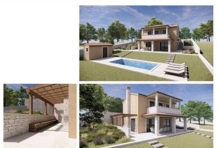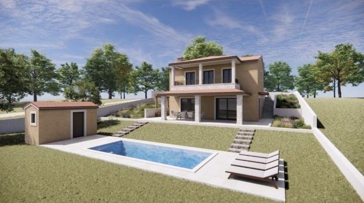 An unfinished house for sale in a small, quiet village near Pazin, surrounded by greenery.