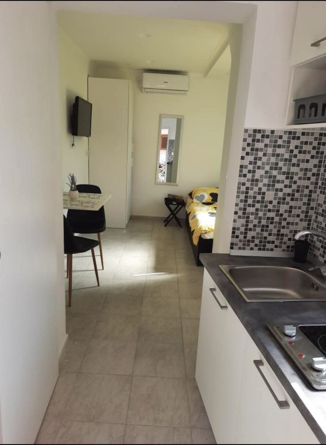 With a total area of 100 square meters, it consists of two studio apartments on the ground floor and a one-bedroom apartment on the first floor.