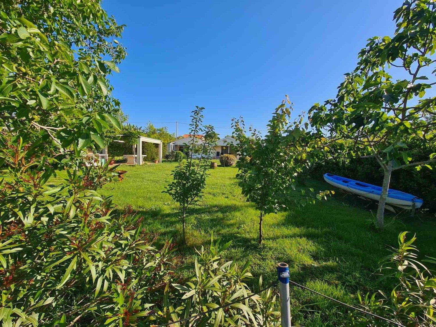 On the outside of the house, there is a storage room where the boiler and water purifier are located. The spacious living room can easily be converted into an additional bedroom if needed, as electrical connections and a window have been prepared for this purpose.