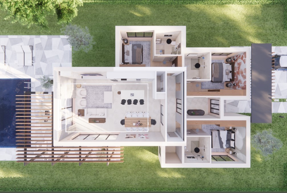 Each villa has 2 parking spaces and a 30m2 swimming pool in the garden.