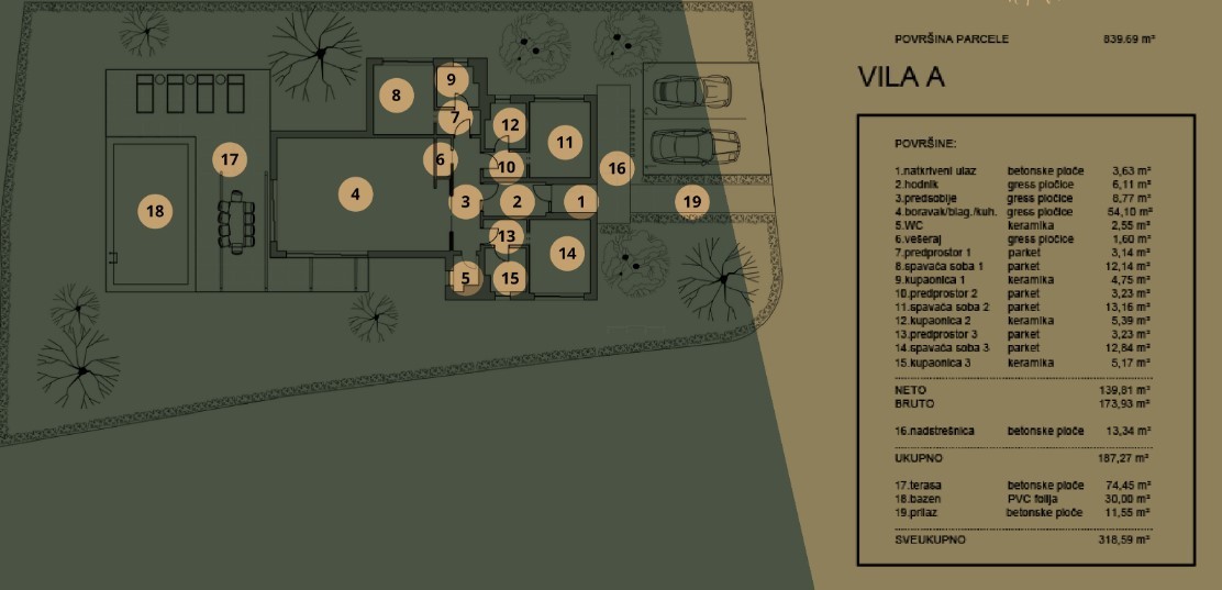 Villa A, located on a plot of 839.69 m2, is a single-story house with a gross area of 187.27 m2.