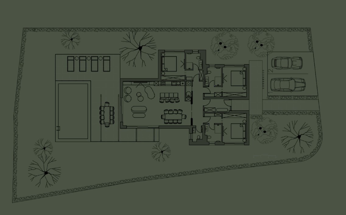 The living room leads directly to the garden, where there is a terrace, swimming pool, and sunbathing area. On the entrance side, there are two parking spaces and a canopy of 13.34 m2.