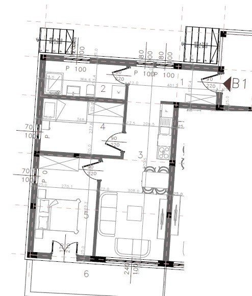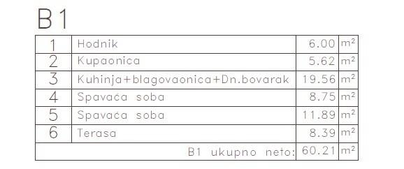 APARTMENT - B1 is located on the 1st floor of the building and consists of: a hallway, bathroom, kitchen + dining area, living room, 2 bedrooms, and a terrace. Total net area: 60.21 m²