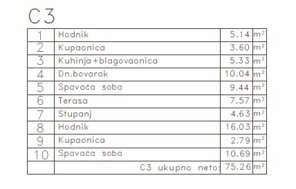 a hallway, 2 bathrooms, a kitchen + dining area, a living room, 2 bedrooms, and a terrace. Total net area: 75.26 m².