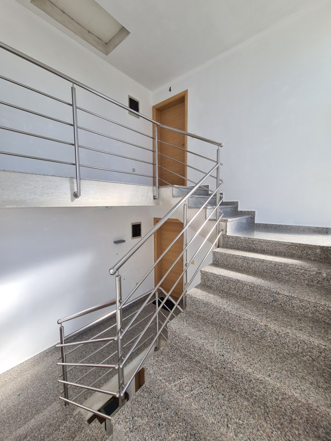 Large, spacious staircase in granite and stainless steel.