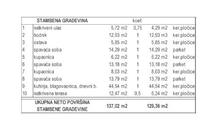 The villa with an area of 137.02 m2 (net area of 129.36 m2) consists of a ground floor and includes: covered entrance, hallway, 2 bathrooms, 3 bedrooms, kitchen, spacious living room and dining room and a covered terrace.