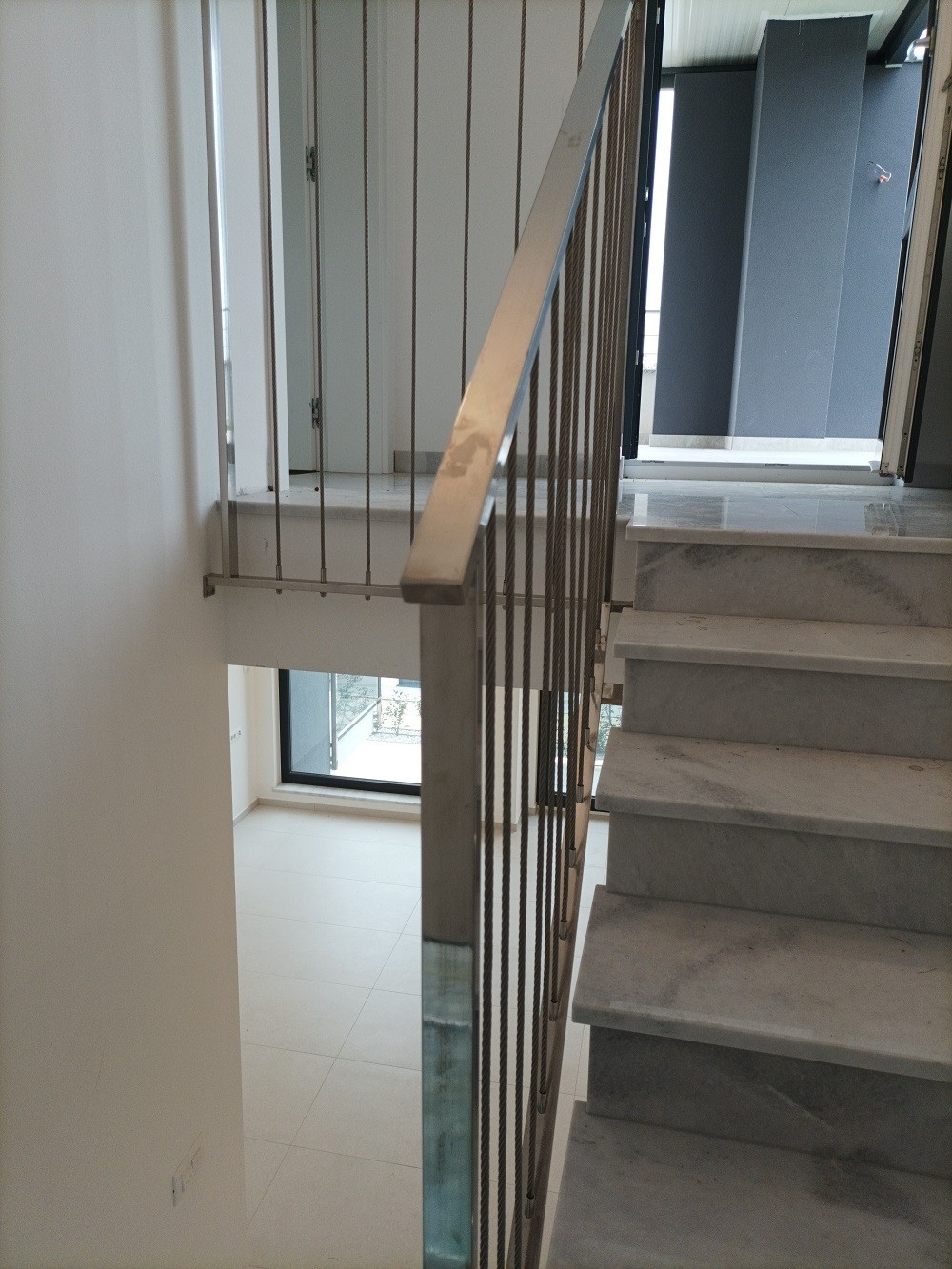 Upstairs, stairs paved with shiny granite lead to the second living room with a toilet.