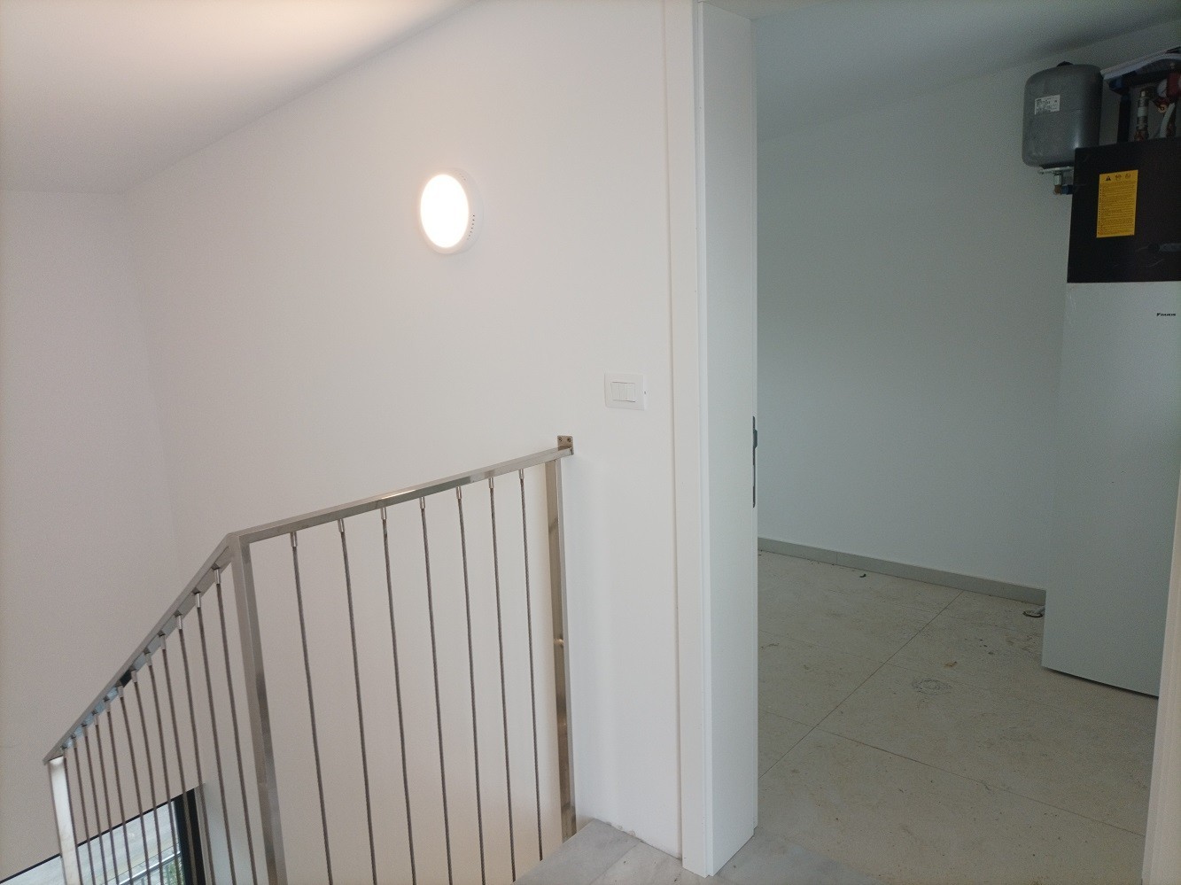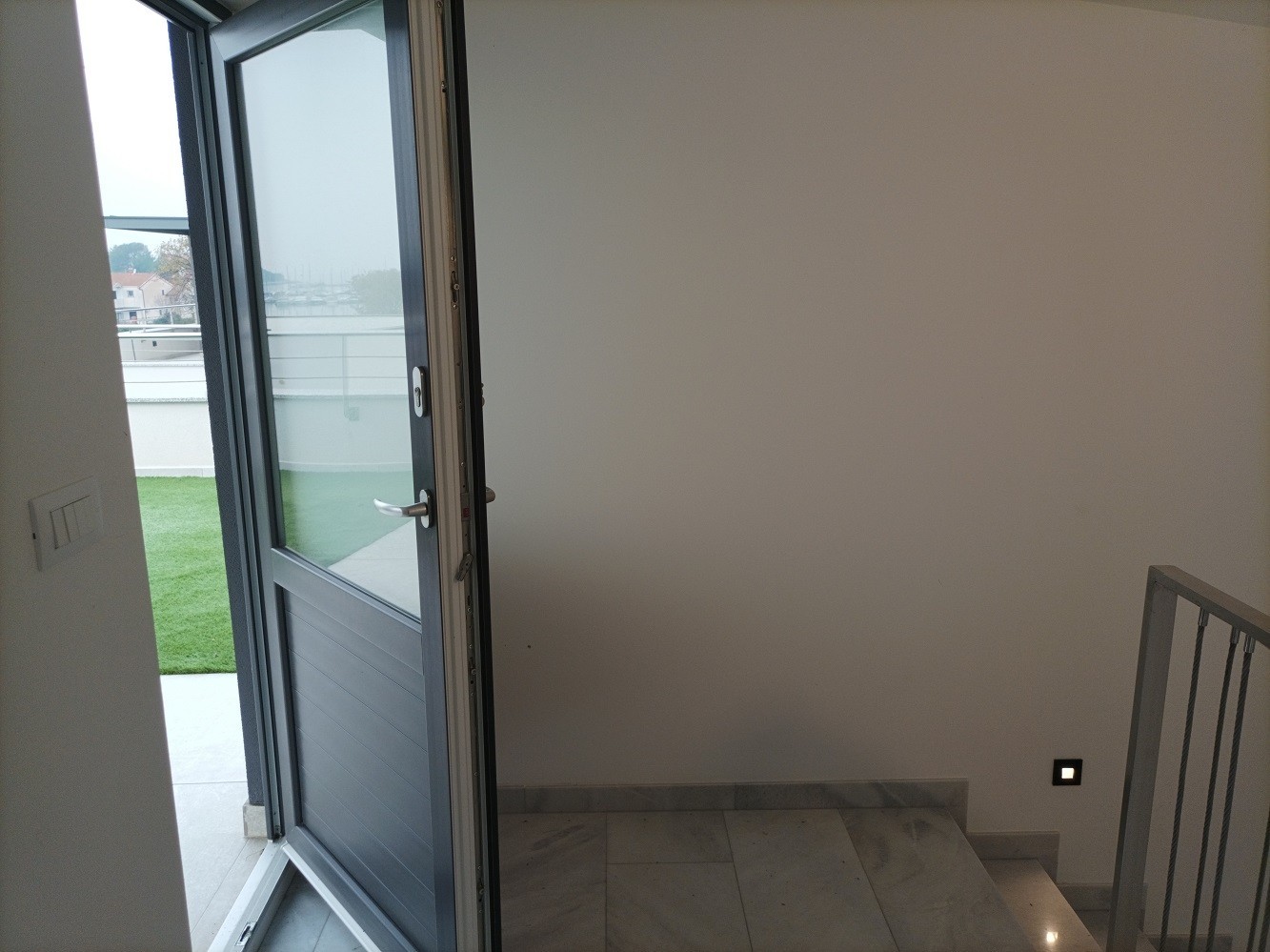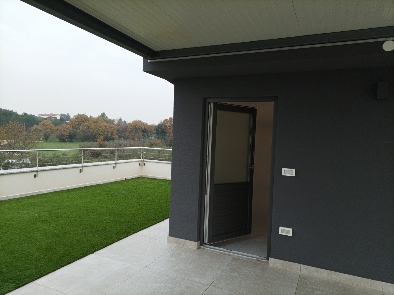 Let's continue up the stairs where in the attic there is 1 smaller room with a central heat pump. Straight from the stairs you can reach a large roof terrace with an overhang. The terrace is covered with soft artificial grass and does not require special maintenance.