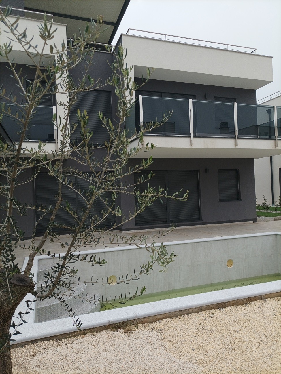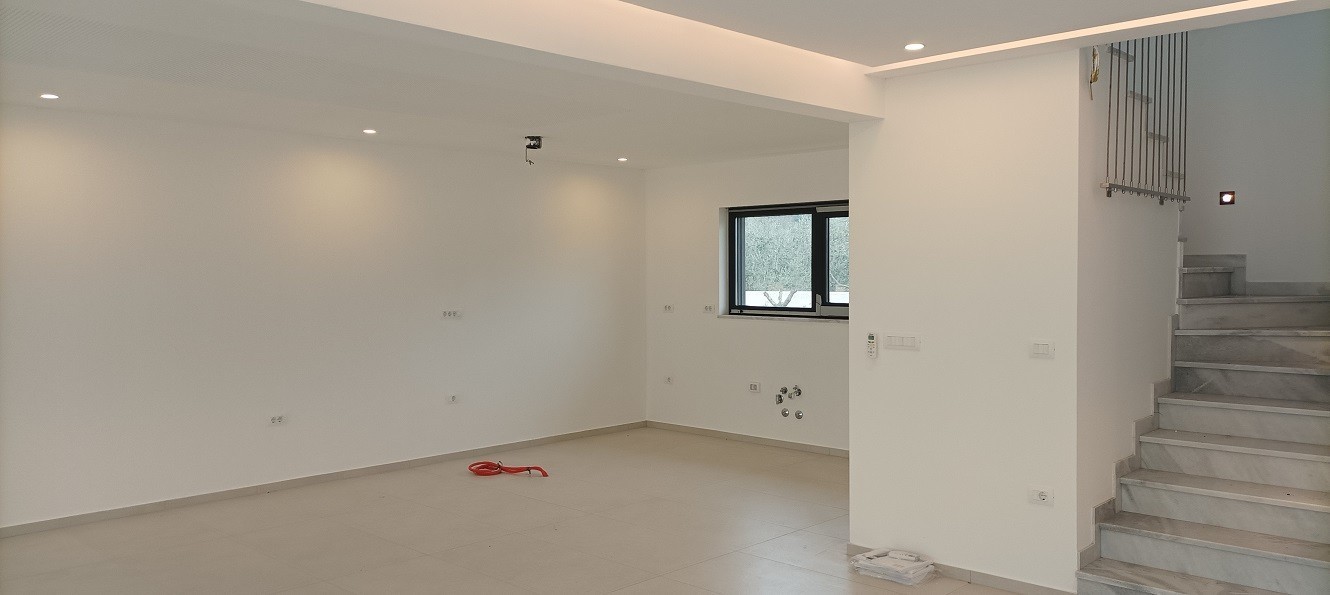 There is also a large open living room with kitchen and dining room, a small storage room. High ceilings, arranged ceiling lighting. The living room is dominated by glass walls with aluminum joinery with access to the garden and pool.