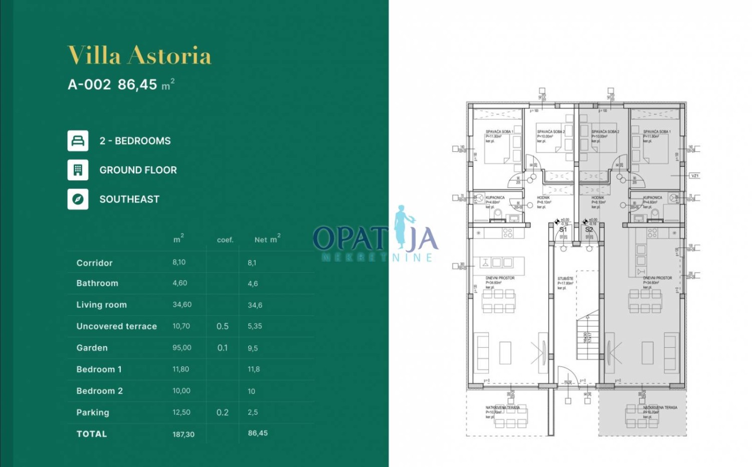 The layout is functional and well designed. The apartment consists of two bedrooms, a hallway, an open-plan kitchen with living and dining area, a bathroom, and a terrace with direct access to the garden.