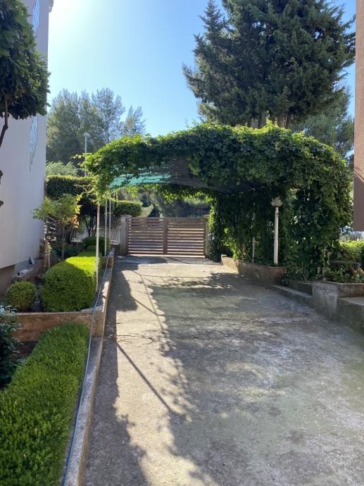The house consists of two floors plus a basement. On the first floor, there is a spacious apartment of 98.7 m² with a large west-facing balcony (12 m²), two bedrooms, a living room, a kitchen, a dining area, and a bathroom. The apartment is filled with natural light and surrounded by views of the pine forest and Mediterranean greenery.