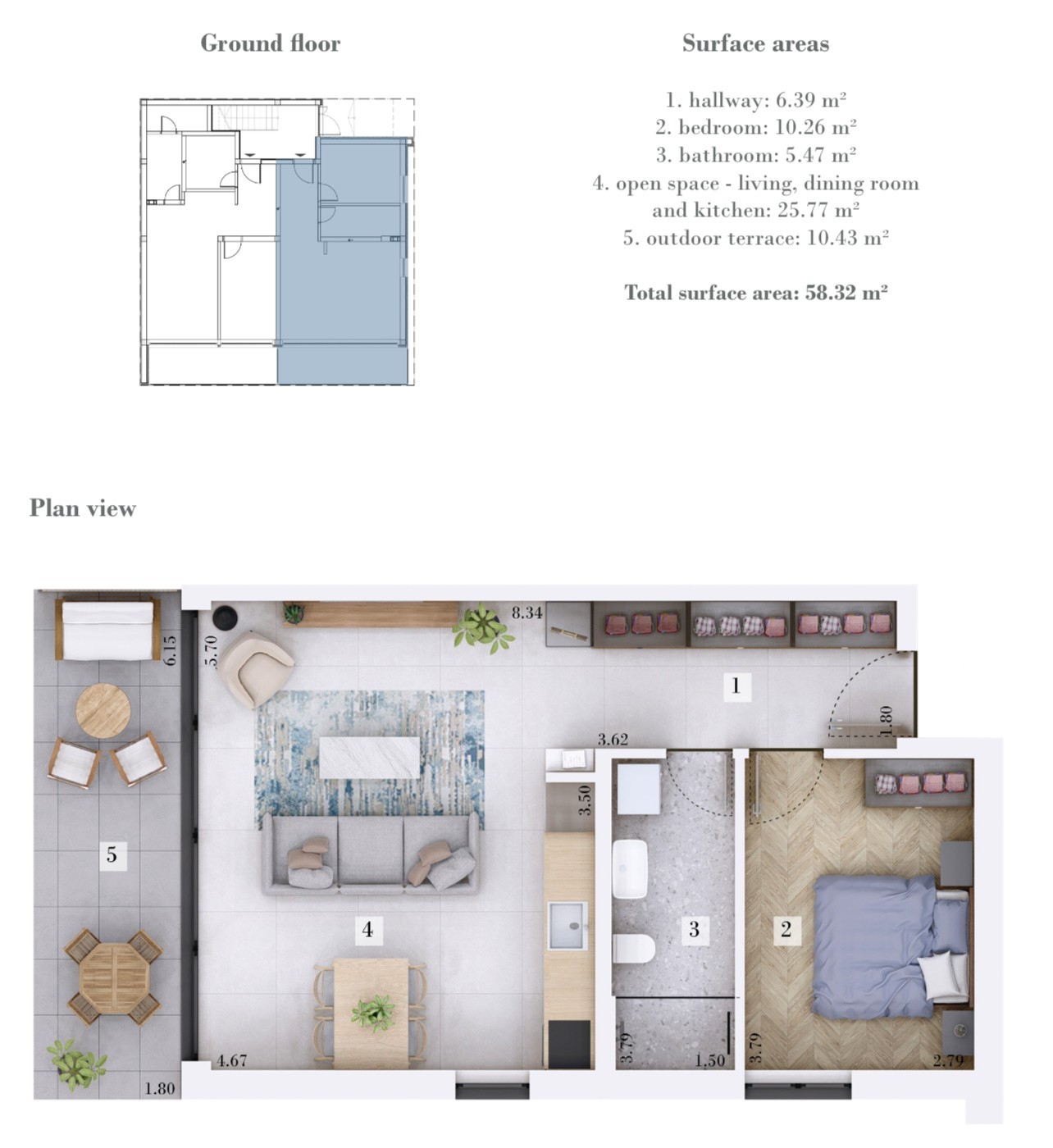 The apartment will be equipped with high-quality systems and materials, including MultiSplit heating and cooling, underfloor heating in the kitchen and bathroom, Italian tiles in most areas, and wooden flooring in the bedroom. Large anthracite-colored aluminum glass portals with triple glazing and lift-slide openings ensure plenty of natural light and additional aesthetic value. The suspended ceiling with an integrated cornice further emphasizes the contemporary design.