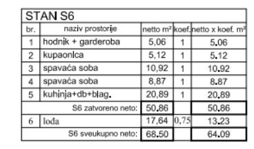 Apartment S6 is located on the first floor of the building and consists of a hallway, two bedrooms, a living room with a kitchen and dining area, and a bathroom. The total net area of the apartment is 68.50 m² (living area 64.09 m²). The apartment is delivered ready to move in, with all bathroom and sanitary furnishings, complete flooring (ceramic or laminate), all sockets and switches, and walls and ceilings painted white.