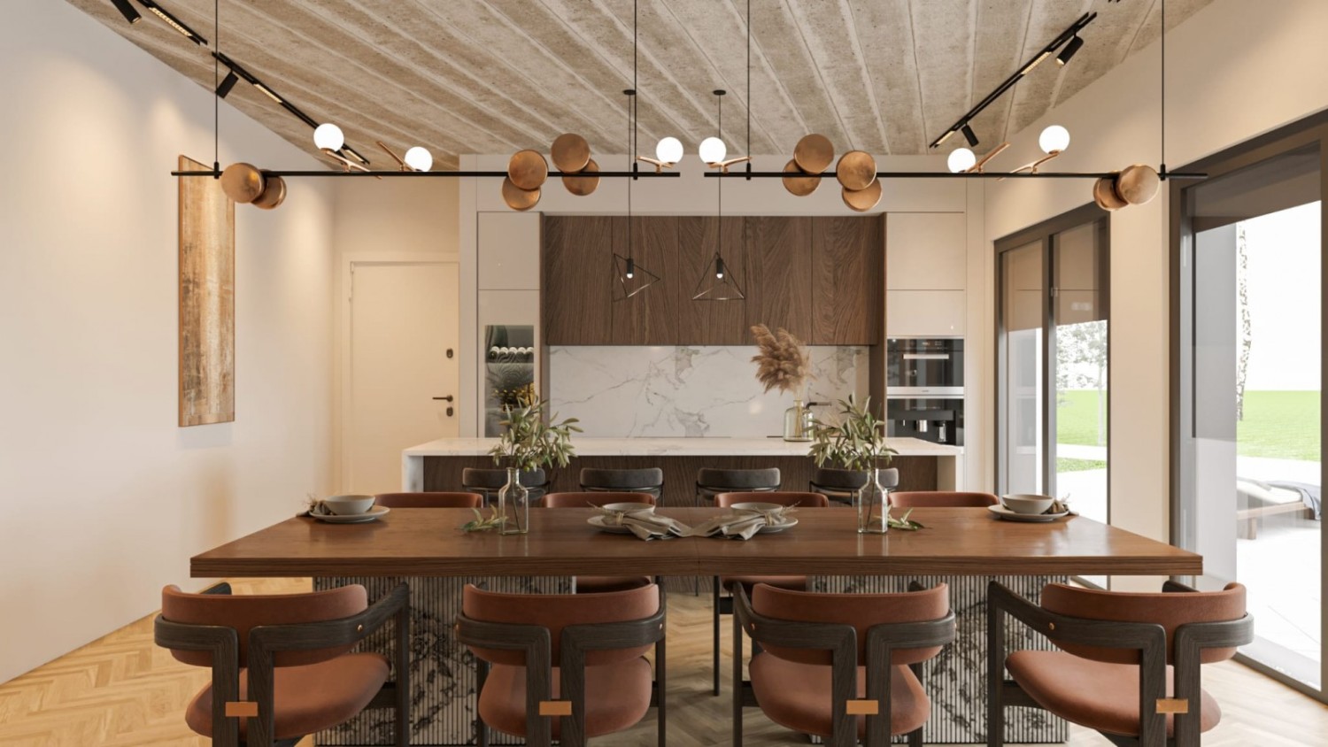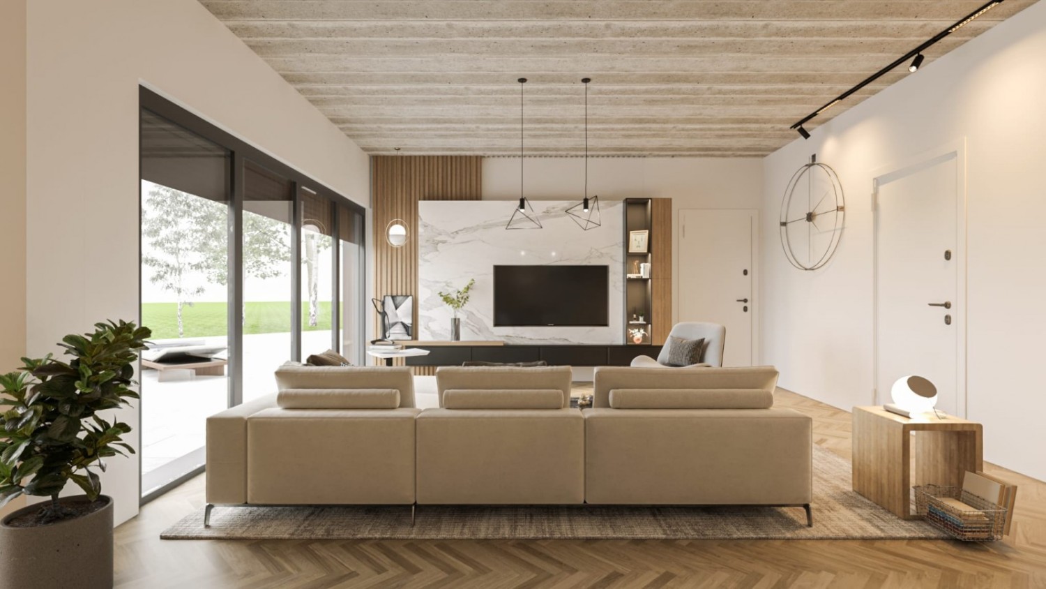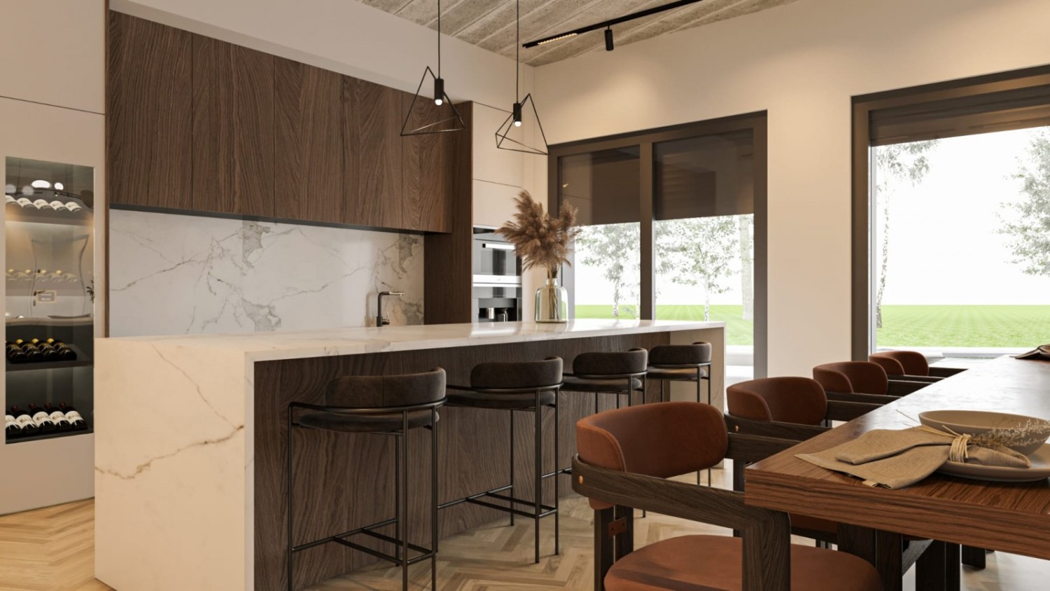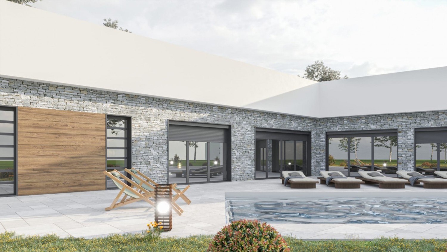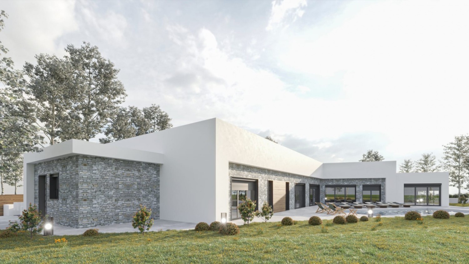 The project includes a modern family house with 4 bedrooms and 4 bathrooms, designed for comfortable and peaceful living. The spacious open-concept living room (72 m²) is filled with light and connects to a magnificent heated infinity pool (10x4 m, depth 135 cm) and a heated winter oasis with an outdoor kitchen, perfect for relaxation.
