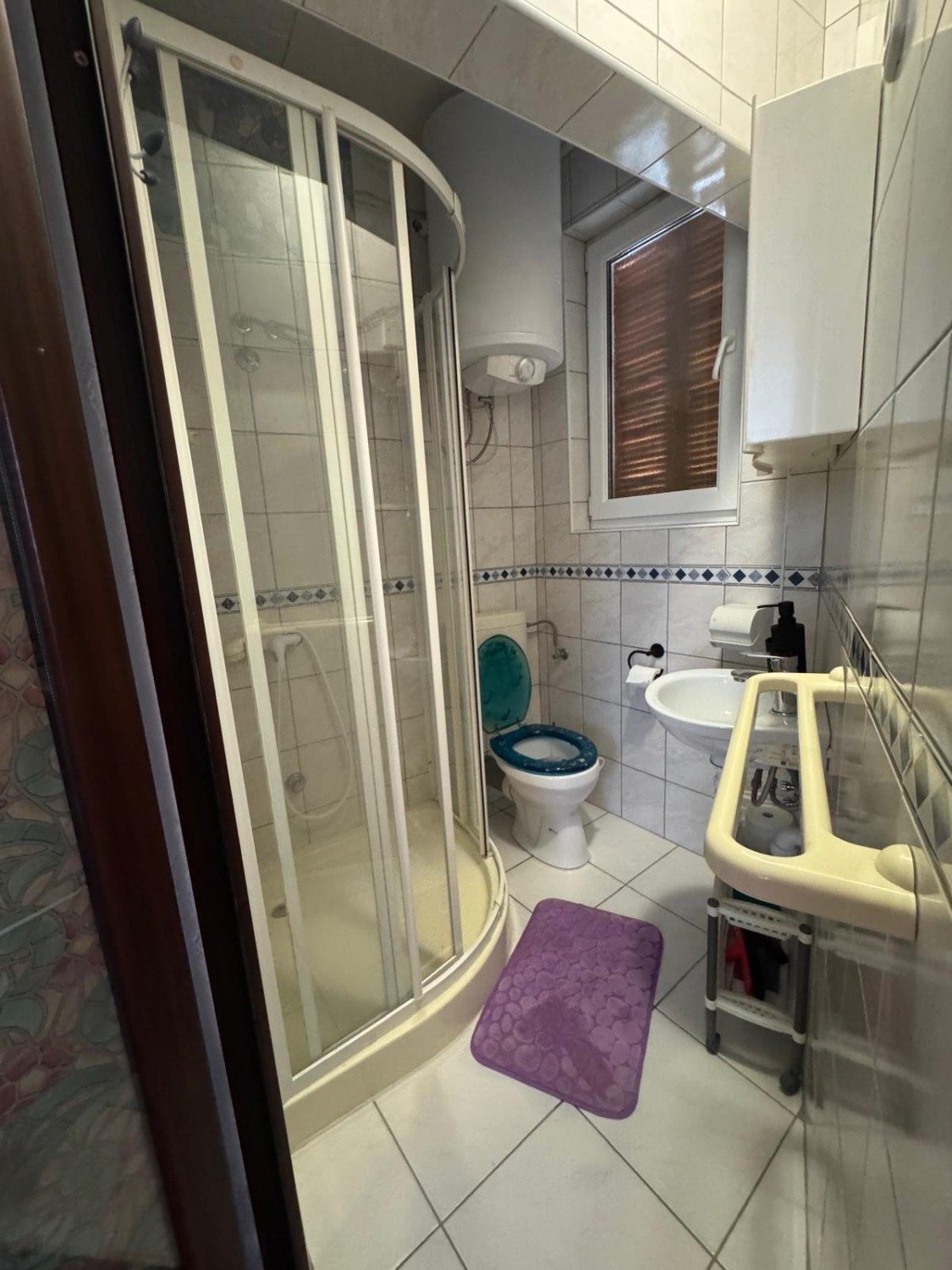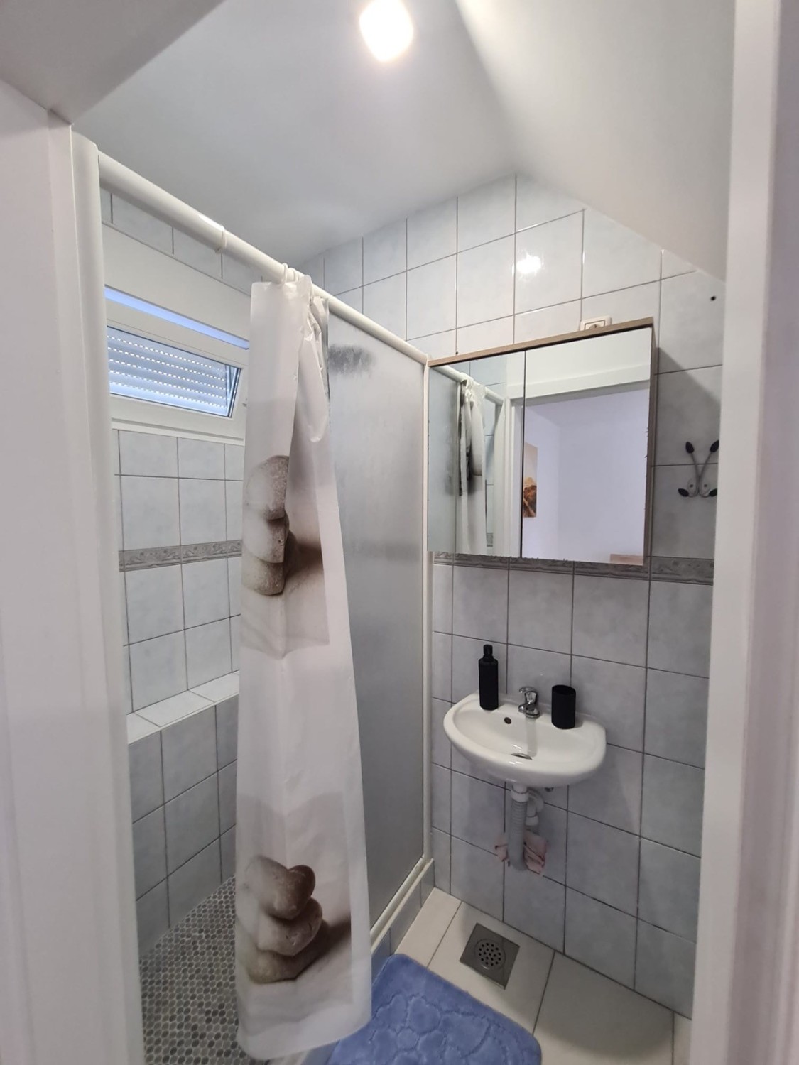In the first part of the house on the ground floor there is one bedroom and a bathroom. Stairs lead to the first floor where there is another bedroom and another bathroom.