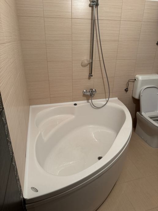 The apartment spans two levels. On the ground floor, there is a living room, a kitchen with a dining area, and access to a covered terrace beneath which a pool is situated – perfect for enjoying warm days. On the upper floor, you will find two bedrooms, a bathroom with a shower and a jacuzzi, as well as an additional separate toilet.