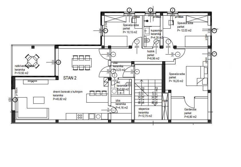 Three-room apartment S2 is located on the 1st floor of a building with a total of 3 apartments, one apartment on each floor, has a living area of 123.30 m2 and consists of the following rooms: